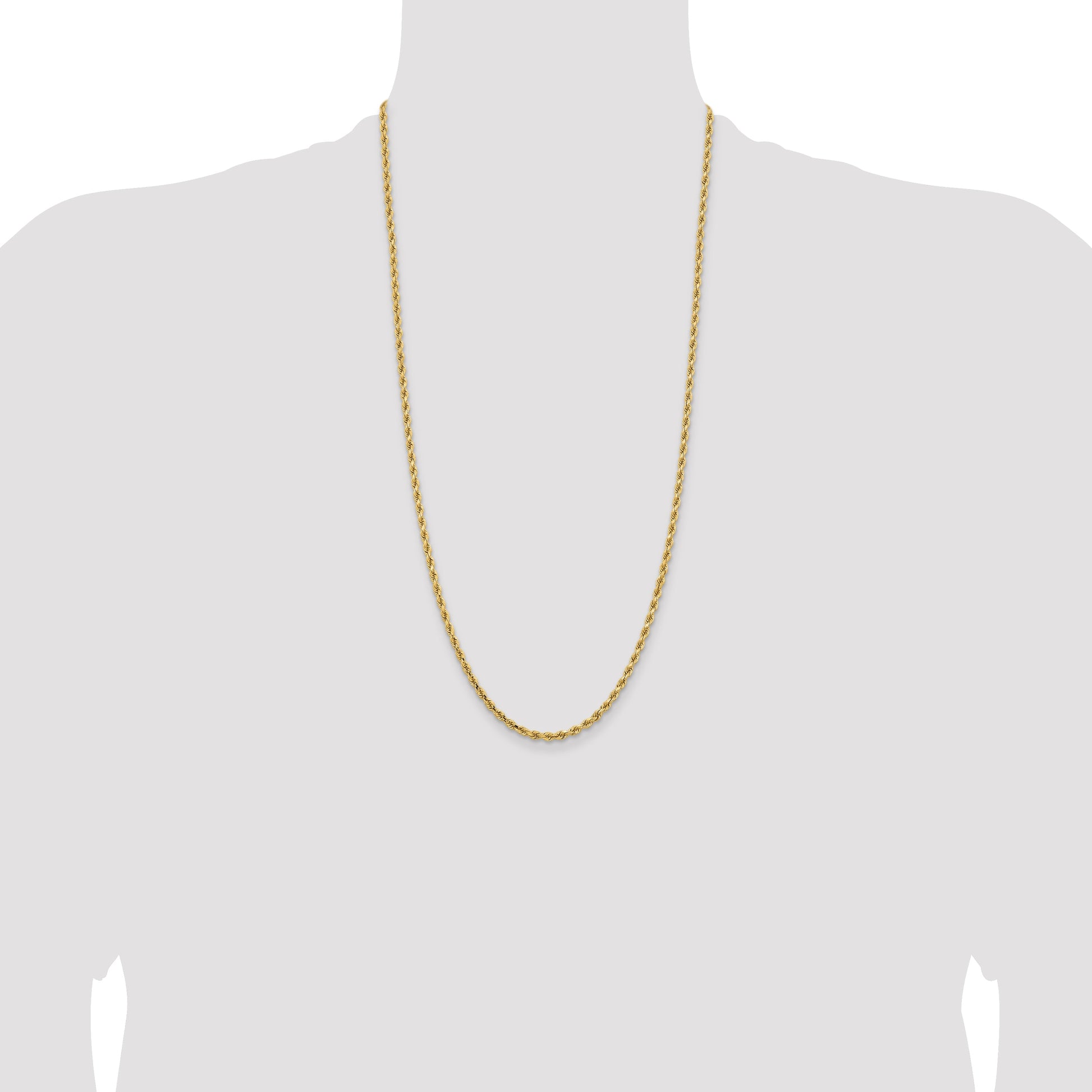 The 14k Yellow Gold 28-inch Diamond-cut Rope Chain radiates timeless elegance. Crafted with 14K gold, this polished piece shines with a refined luster. The 28-inch length and 3.25mm width create a versatile look suitable for any occasion. Its robust rope design is enhanced with a diamond-cut texture, adding a touch of sparkle. Secure it effortlessly with the durable lobster clasp. This women's necklace blends style and strength, making it a must-have in your jewelry collection. Adorn yourself with the 14k Yellow Gold 28-inch Diamond-cut Rope Chain for a classy and beautiful statement.