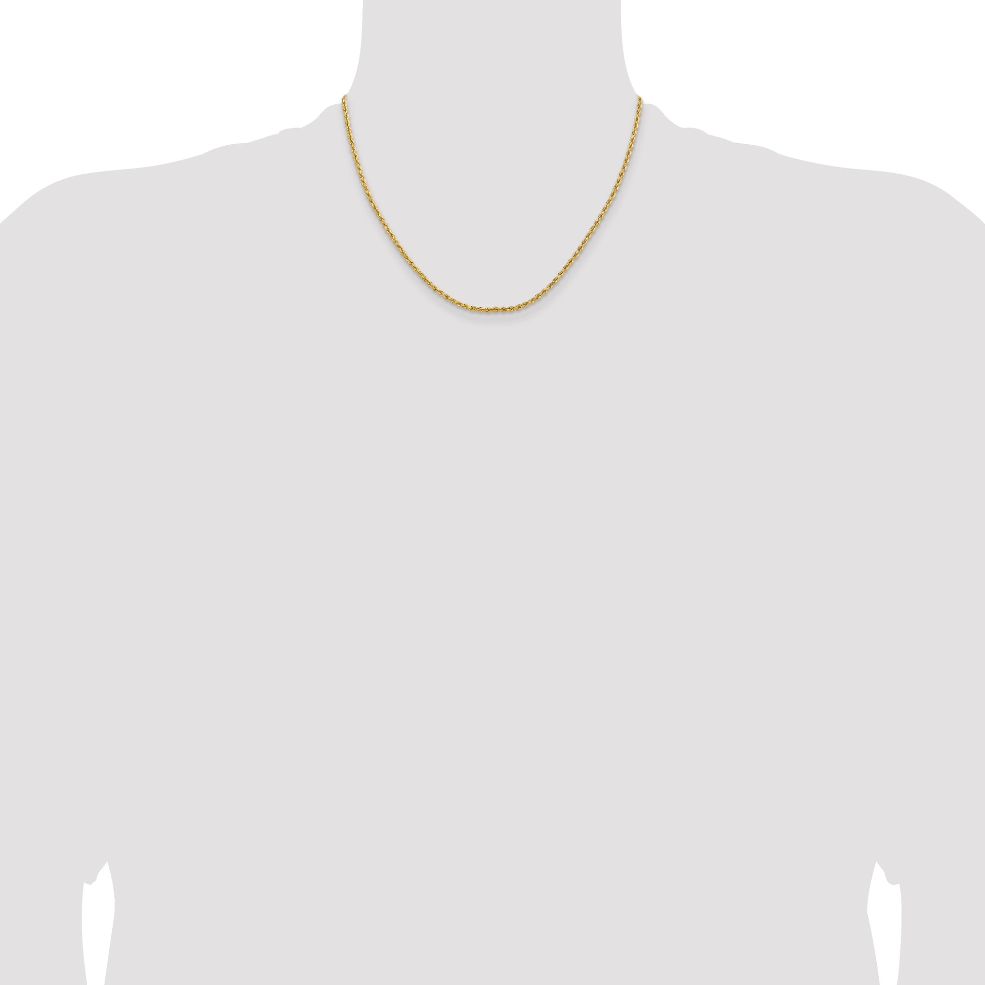 The 14k Yellow Gold 2mm Lightweight D/C Rope Chain with Lobster Clasp is a perfect addition to your jewelry collection. Crafted from 14k pure gold, this chain showcases a stunning diamond-cut texture that reflects light beautifully. The 18-inch length and 2 mm width make it an ideal choice for everyday wear, striking a balance between elegance and comfort. The sturdy lobster clasp ensures a secure fit. Add a touch of timeless style to any outfit with this 14k Yellow Gold 2mm Lightweight D/C Rope Chain.