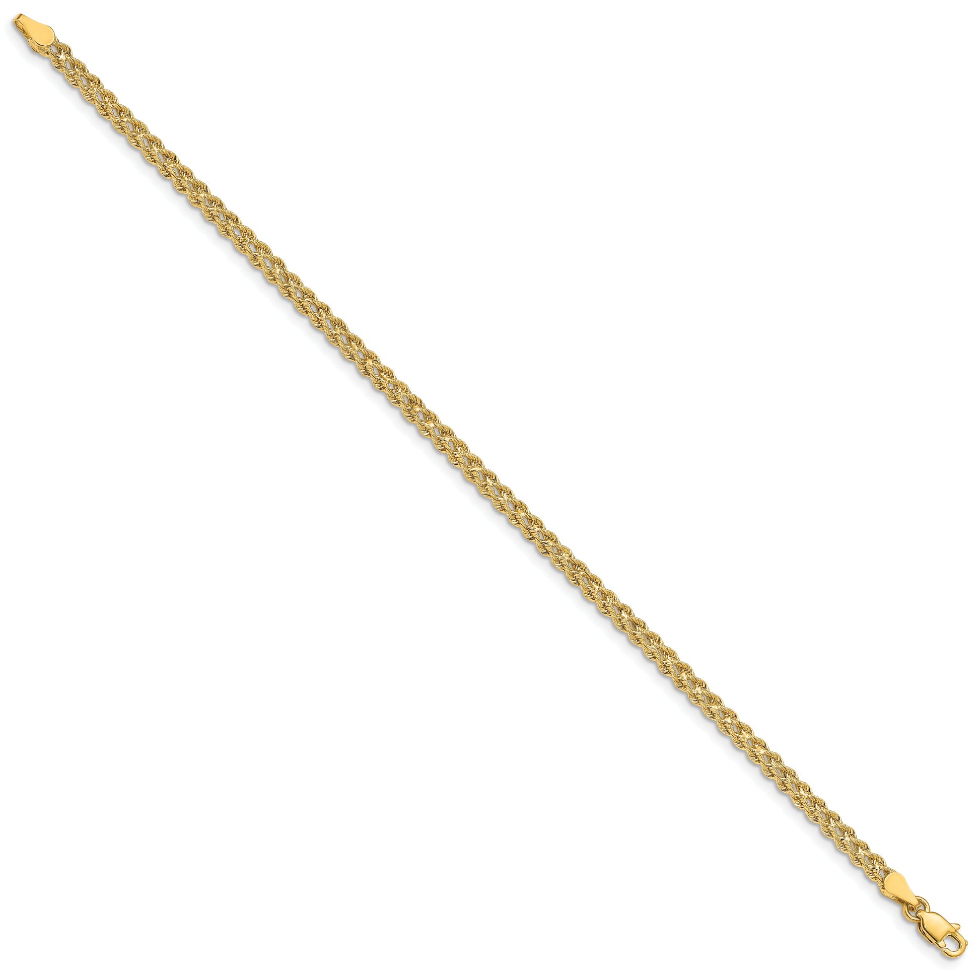 Introducing the stunning 14k Yellow Gold 3.0mm Wide Double Strand Rope Bracelet, where elegance meets durability. Crafted from 14k gold with a polished finish, this 7-inch bracelet sports a solid, diamond-cut rope chain. A secure lobster clasp ensures a snug fit. The 3mm width gives it a substantial feel without being too heavy. Perfectly designed, this double strand rope bracelet brings a touch of class to any outfit, making the 14k Yellow Gold 3.0mm Wide Double Strand Rope Bracelet an essential addition to your jewelry collection.
