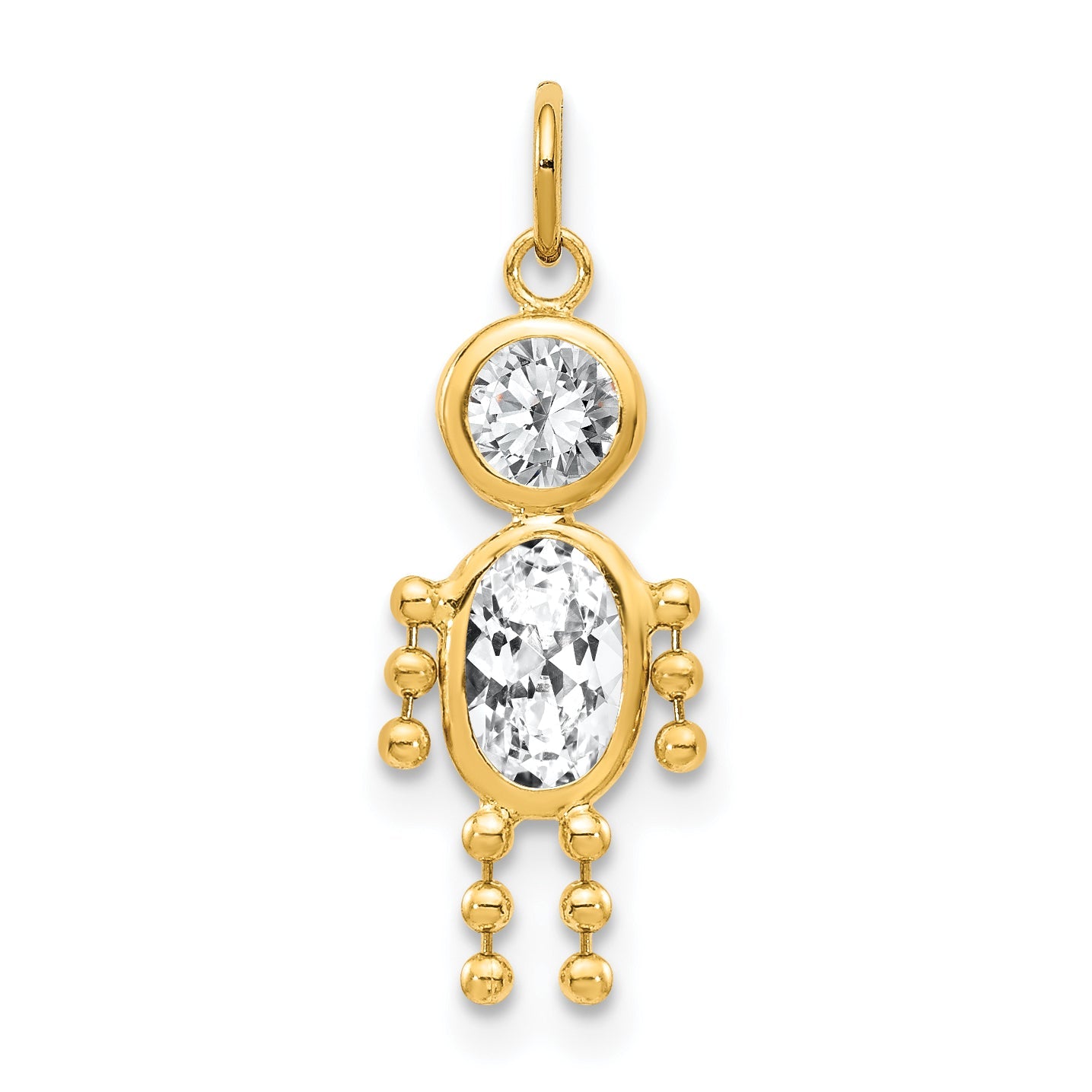 Featuring the charming Yellow Gold 14k April Boy Birthstone Charm made with utmost purity. Crafted from 14K gold, the jewel flaunts a white Cubic Zirconia stone, carved with precision to form an oval shape. The charm also hosts a round-shaped cz stone. Each stone measures 6x5 mm and 4 mm respectively, adding a touch of elegance to the charm. The gold charm, shaped like a boy, measures 19 mm in length and 9 mm in width, showcasing excellent craftsmanship. This birthstone charm, symbolic of April birth month, is the perfect accent piece for your collection. Amp up your ensemble with this brilliantly designed Yellow Gold 14k April Boy Birthstone Charm.