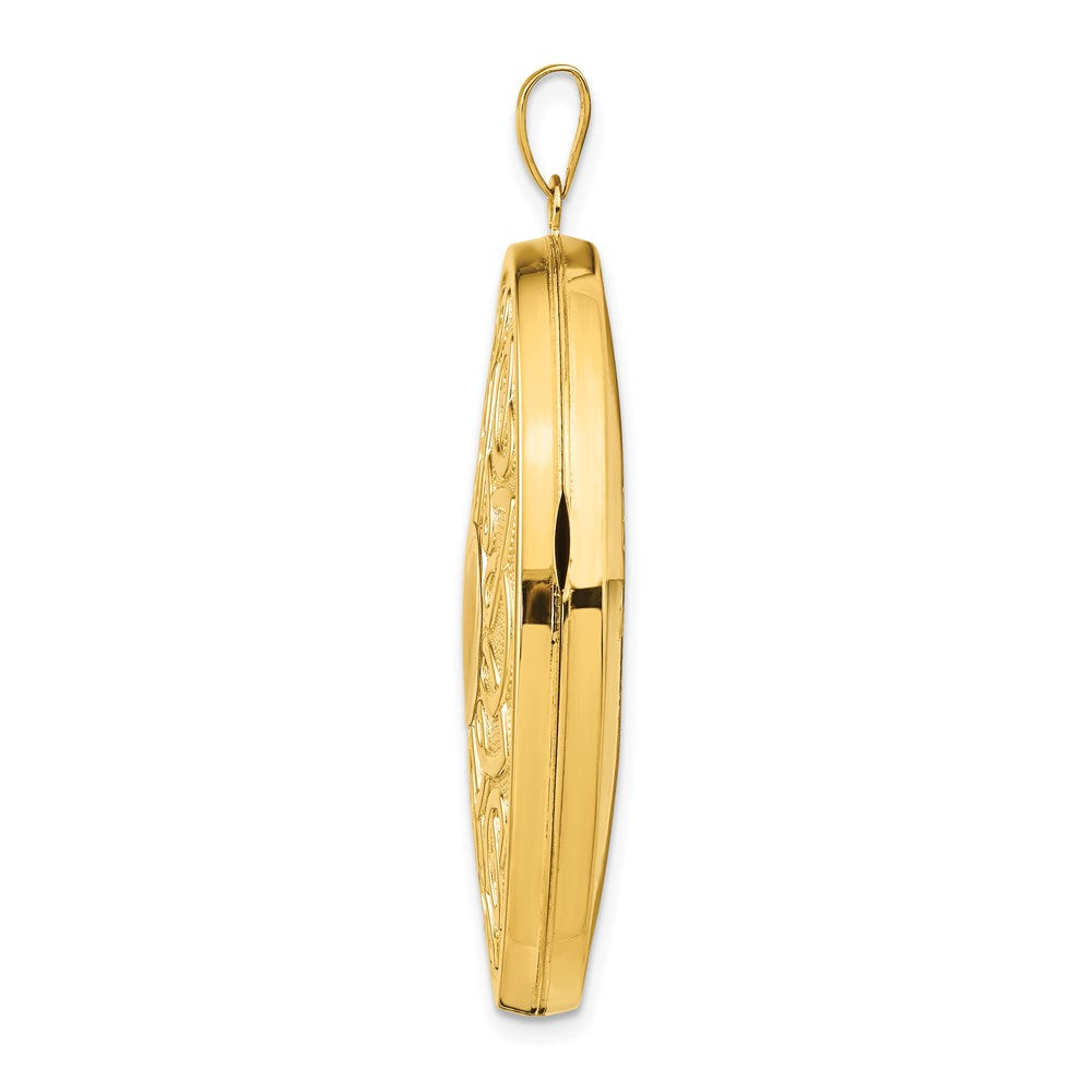The 14k Celtic Heart 38mm Oval Locket is a stunning piece that embodies elegance and sentiment. Crafted from 14k yellow gold with a polished finish, it shines beautifully. This locket opens to reveal space for two cherished photos, keeping your most treasured memories close. It features a unique reversible design with textured accents, adding a touch of charm. Measuring 46.8mm in length and 28.15mm in width, this locket is perfect for women who appreciate fine jewelry. Elevate your collection with the 14k Celtic Heart 38mm Oval Locket, a timeless addition that captures both beauty and love.