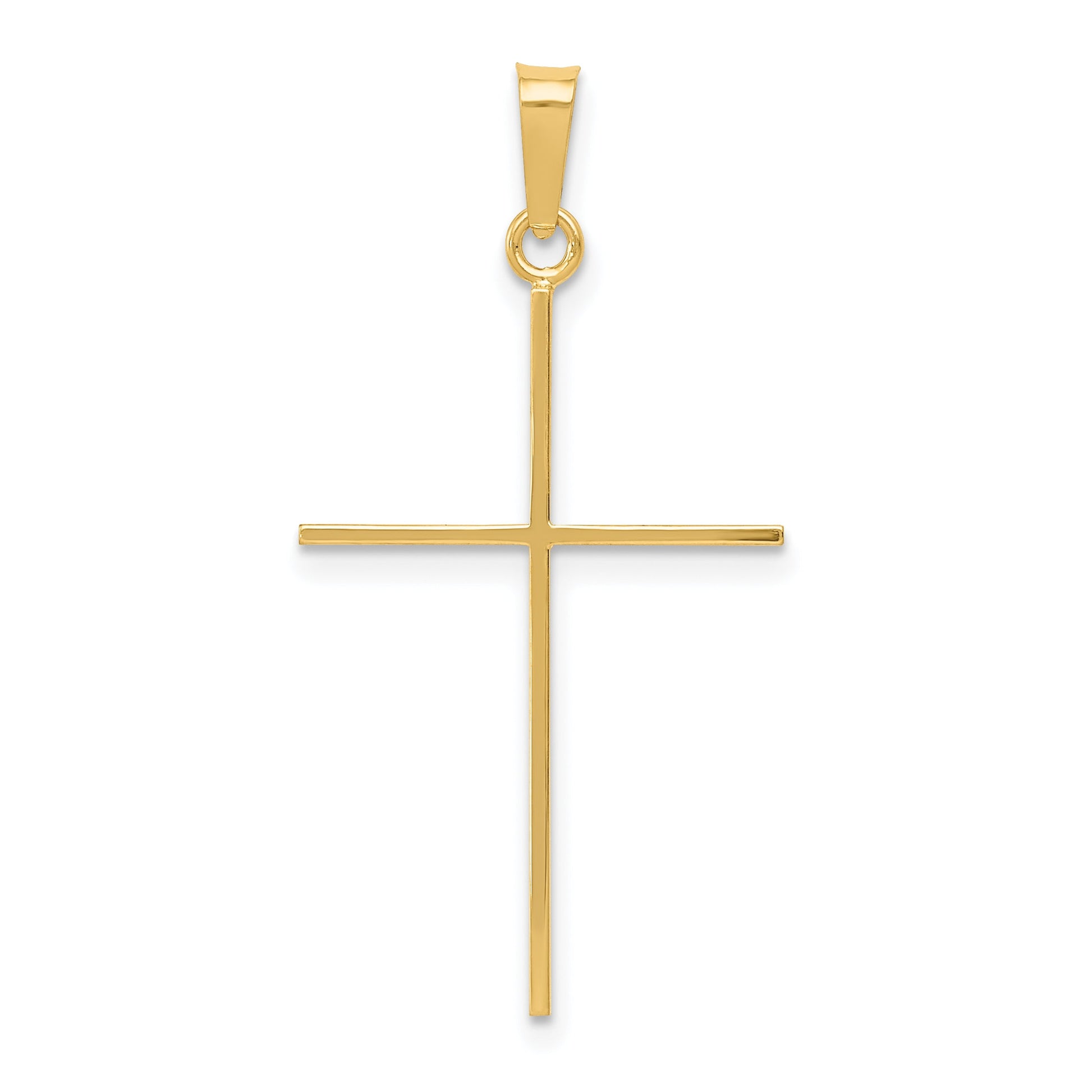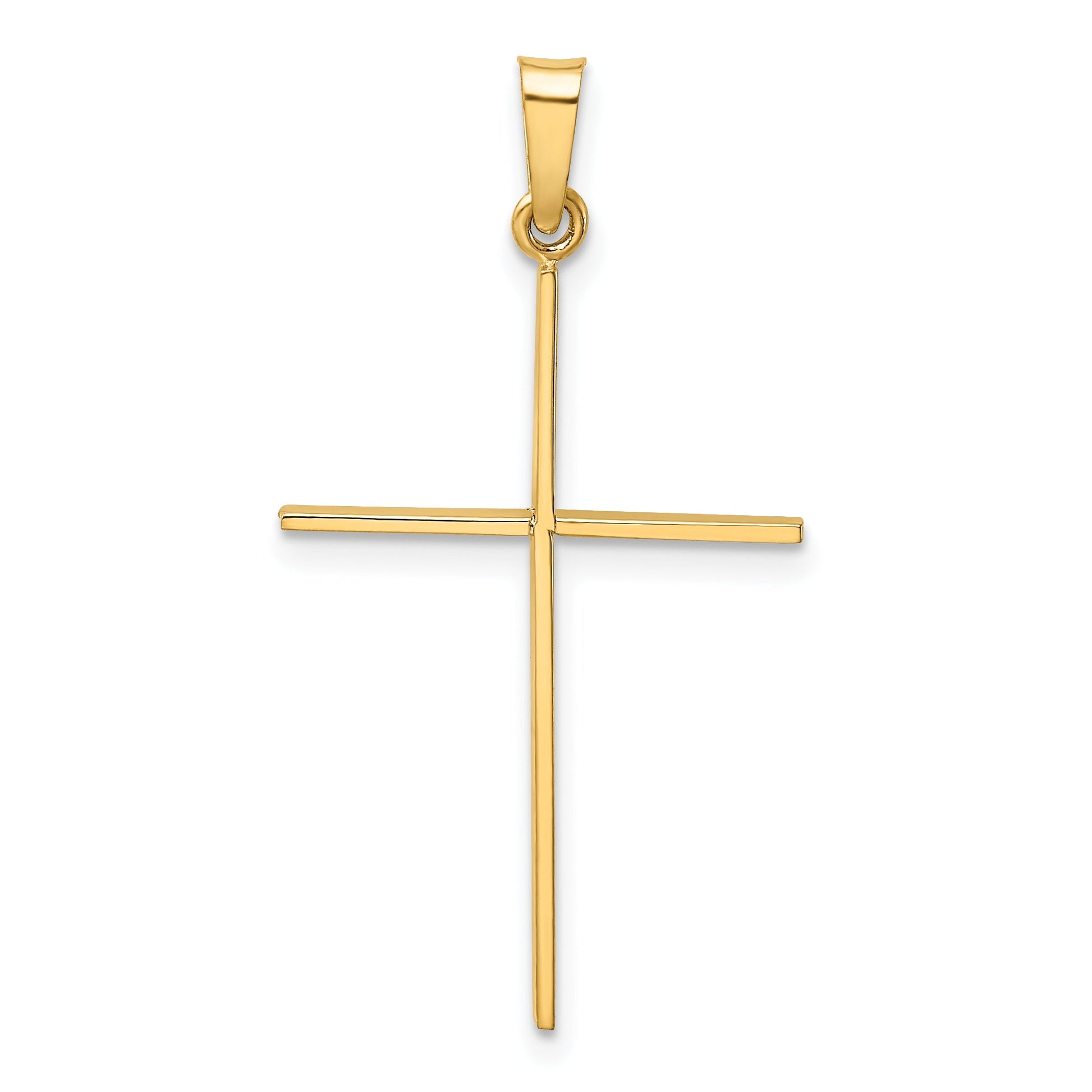 Introducing the stunning 14k Yellow Gold Cross Pendant, a must-have for your jewelry collection. This pendant shines bright with its polished finish and solid design. Measuring 34 mm in length, it features a beautifully crafted charm that is 28.6 mm long and 18 mm wide. The flat back profile allows for comfortable wear. Each piece is made from high-quality 14K gold, ensuring durability and style. The bail's 6.4 mm length and 2.35 mm width make it easy to pair with your favorite chain. Enhance your look with the elegant 14k Yellow Gold Cross Pendant today!