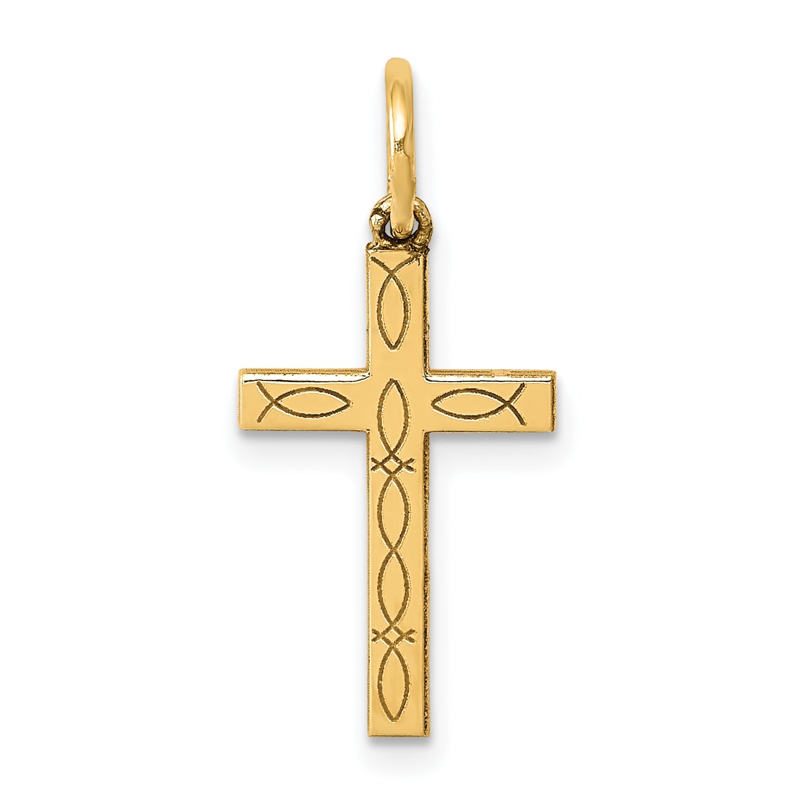 The 14k Yellow Gold 14K Laser Cut Ichthus Cross Charm is a stunning piece that blends faith and style. Crafted from pure 14k yellow gold, this charm boasts a polished finish with precise laser cut designs. Measuring 21 mm in length and 11 mm in width, it’s perfect for wearing on a chain or adding to a charm bracelet. Its flat back profile makes it comfortable against the skin, while the themed design symbolizes a deep connection to one's beliefs. Elevate your jewelry collection with the 14k Yellow Gold 14K Laser Cut Ichthus Cross Charm today.