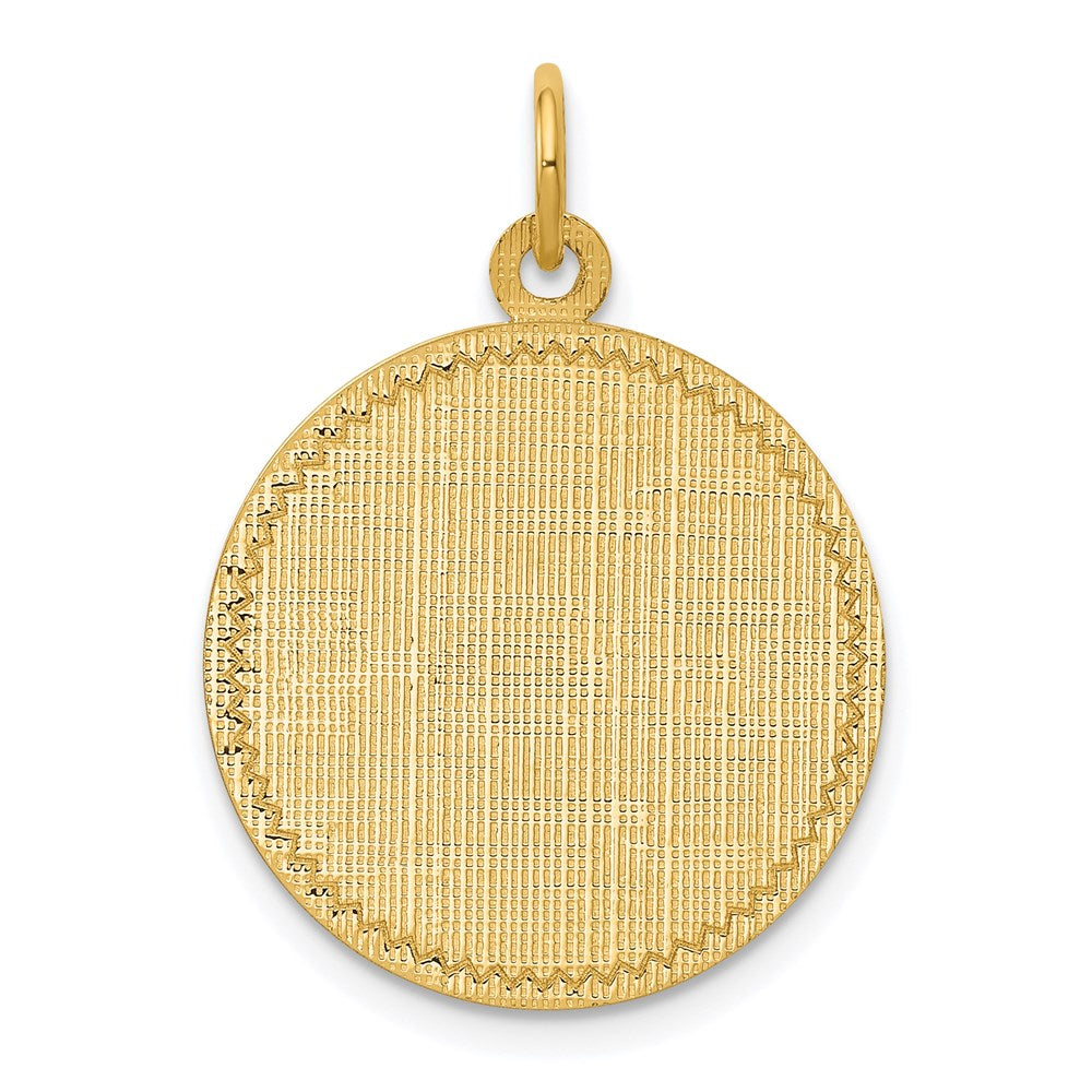 The 14k Yellow Gold Patterned Circular Engravable Disc Charm adds a touch of elegance to any jewelry collection. Crafted from solid 14k gold, this charm features a mix of polished and brushed finishes, measuring 26mm in length and 19mm in width. Its lightweight design, with a thickness of just 0.013 gauge, makes it perfect for daily wear. Personalize this charm with your favorite engraving for a unique piece that speaks to your style. The diamond-cut edges and textured surface enhance its sophistication. Elevate your jewelry game with the 14k Yellow Gold Circular Engravable Disc Charm today!
