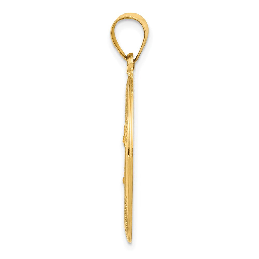 The 14k Yellow Gold Sacred Heart of Jesus Medal Hollow Pendant is a stunning piece of jewelry that combines faith and style. Crafted from high-quality 14K gold, this pendant boasts a polished and satin finish. It measures 27 mm in length and 17 mm in width, making it a noticeable yet elegant addition to your collection. Its hollow design adds a unique lightness, while the die-struck manufacturing process ensures durability. With a bail width of 4 mm and a bail length of 6 mm, it easily hangs on your favorite chain. Showcase your devotion with the 14k Yellow Gold Sacred Heart of Jesus Medal Hollow Pendant.