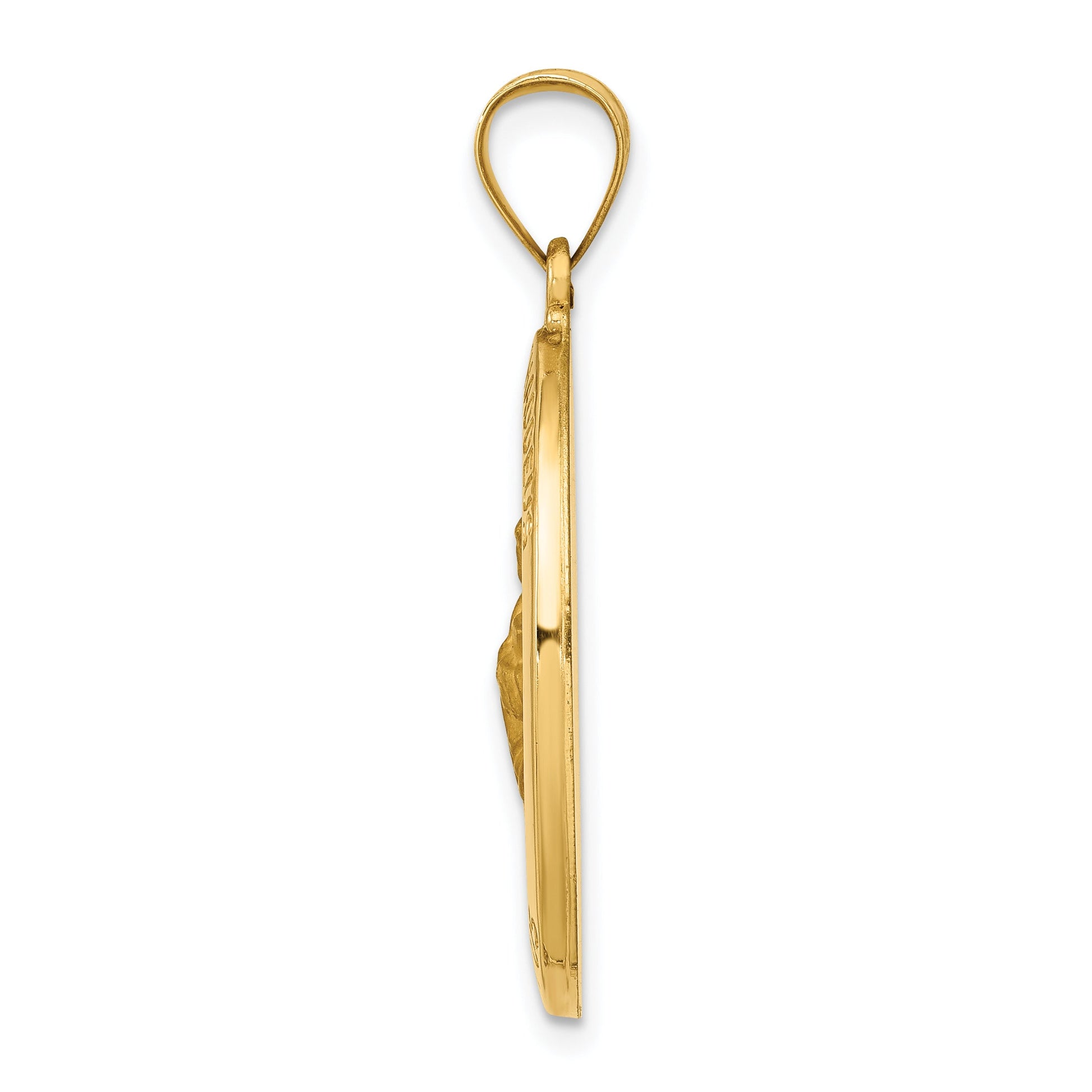 The 14k Yellow Gold St. Jude Thaddeus Medal Hollow Pendant shines with elegance and faith. Crafted from solid 14k gold, its polished and satin finish adds a unique touch. Measuring 31.5 mm in length and 16.5 mm in width, this themed charm features a distinctive flat back for comfortable wear. The hollow design makes it lightweight, perfect for everyday use or special occasions. With a bail width of 4.15 mm, it easily attaches to your favorite chain. Elevate your jewelry collection with the stunning 14k Yellow Gold St. Jude Thaddeus Medal Hollow Pendant, a piece that blends style and meaning seamlessly.