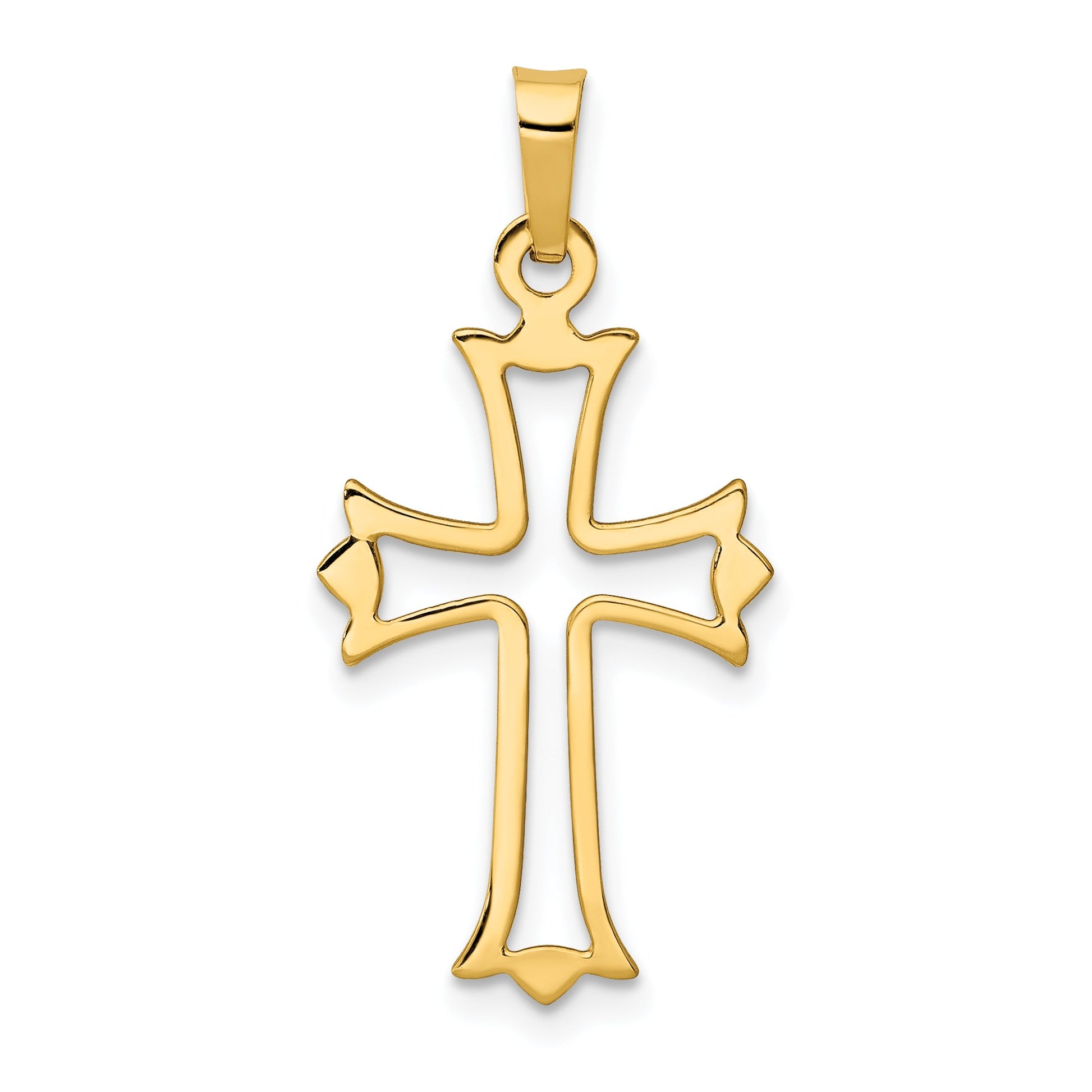 Discover the stunning 14k Yellow Gold Polished Cut-out Fleur de Lis Cross Pendant, a perfect blend of elegance and faith. Crafted from high-quality 14k gold, this pendant features a unique hollow design that enhances its shine. Measuring at 27.91 mm in length and 13.67 mm in width, it offers a striking profile that is sure to grab attention. The flat back design ensures it sits comfortably against the skin. With a 2.25 mm bail width, it's easy to pair with your favorite chain. Elevate your jewelry collection with the timeless charm of the 14k Yellow Gold Polished Cut-out Fleur de Lis Cross Pendant.