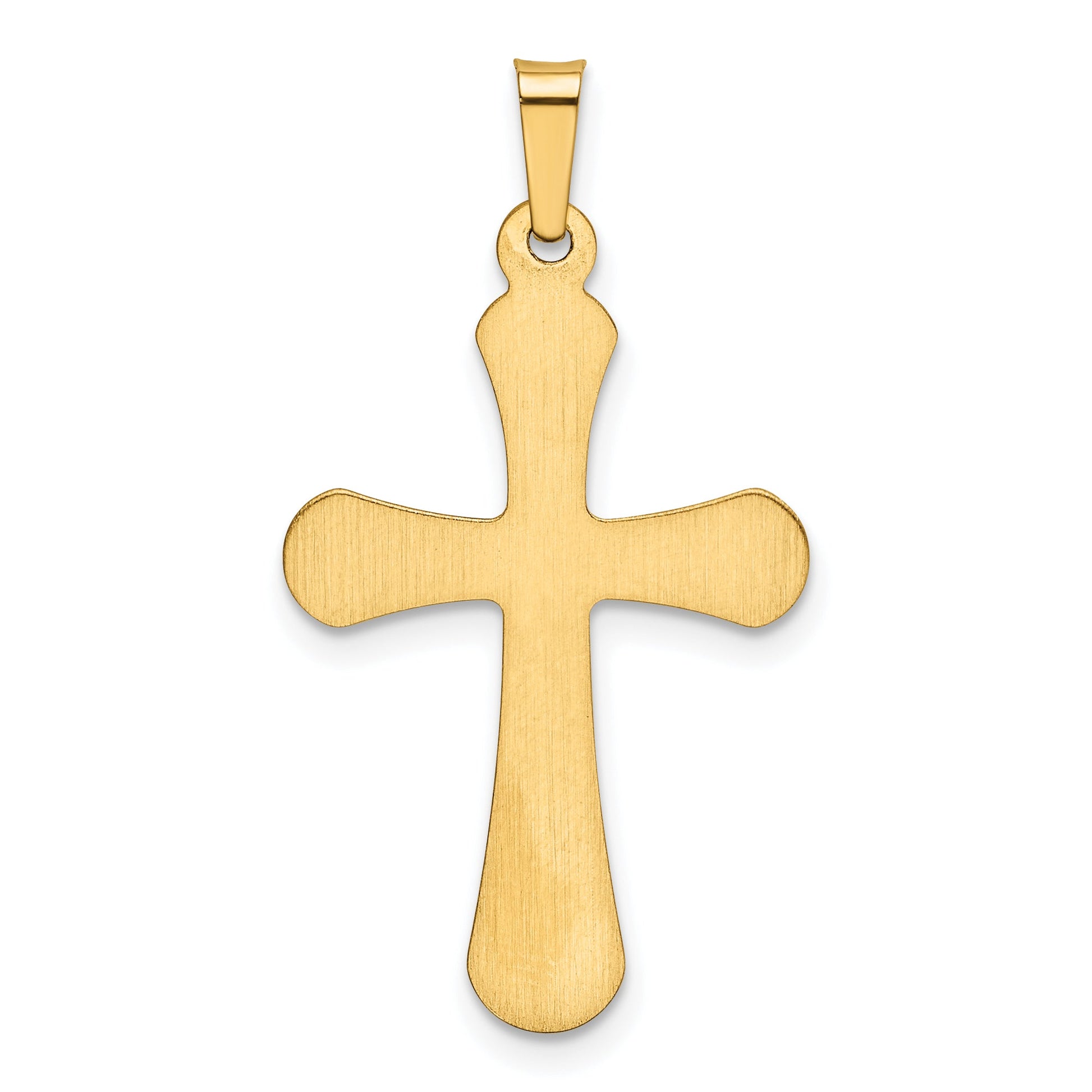 Introducing the stunning 14k Yellow Gold Polished Rounded Cross Pendant, a true statement piece. This exquisite pendant features a sleek and polished finish, crafted from genuine 14K yellow gold. Its hollow design adds a lightweight feel, making it perfect for everyday wear or special occasions. With dimensions of 31.23 mm in length and 16.61 mm in width, this cross pendant captures attention without overpowering your style. The flat back profile ensures it sits comfortably against your skin. Elevate your jewelry collection with the 14k Yellow Gold Polished Rounded Cross Pendant, a timeless symbol of faith and style.