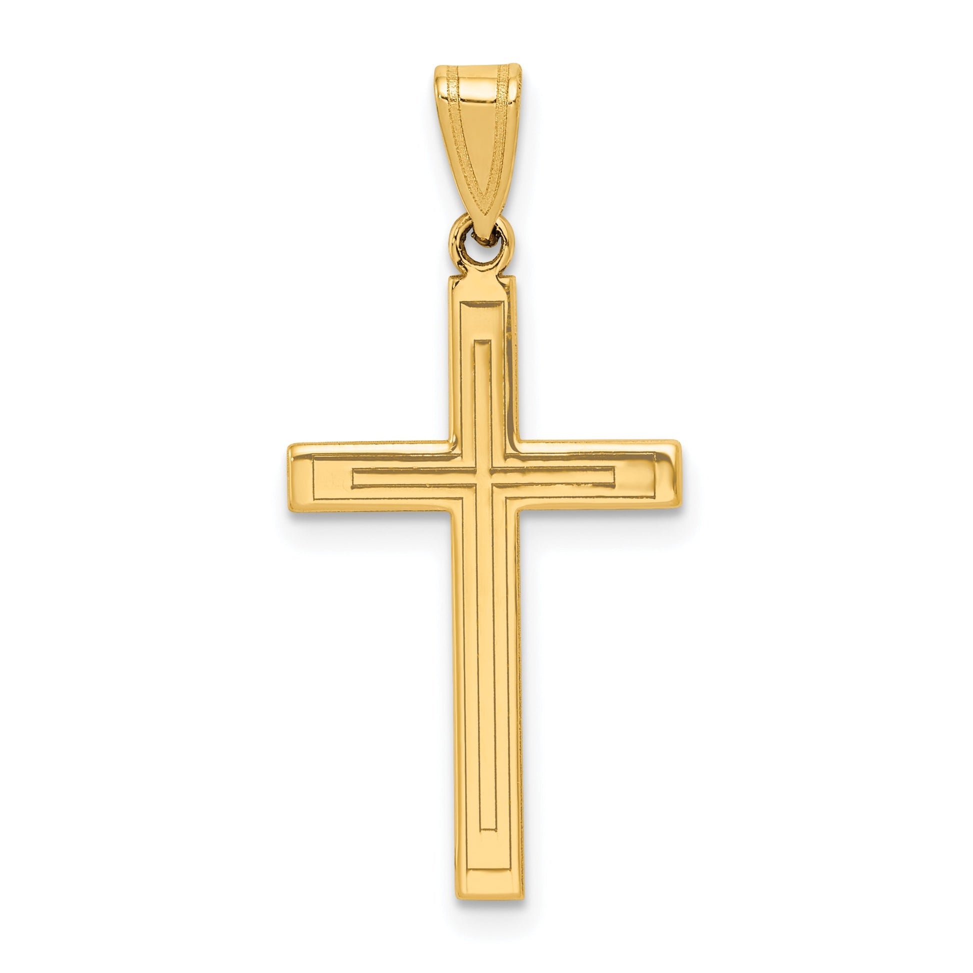 Introducing the 14k Yellow Gold Solid Laser Etched Cross Pendant, a stunning blend of elegance and meaning. Crafted from solid 14k gold, this pendant shines with a polished finish. Its laser-etched design adds a unique touch to its classic look. Measuring 21 mm in length and 15 mm in width, it’s the perfect size for everyday wear or special occasions. With a flat back for comfort and a durable bail, this piece makes a strong statement of faith. Illuminate your style with the 14k Yellow Gold Solid Laser Etched Cross Pendant, a timeless addition to your jewelry collection.