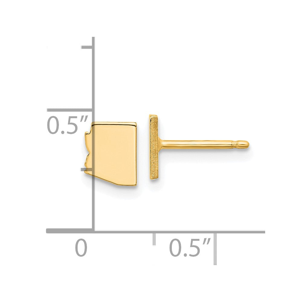The 14K Yellow Gold 14Ky Arizona State Earrings showcase a charming design inspired by the Grand Canyon State. Crafted from polished 14-karat yellow gold, these earrings measure just 6.8 mm long and 5.96 mm wide, making them perfect for daily wear. Their simple button style features a secure post and push-back closure, ensuring comfort and ease. With a size suited for women who love subtle yet meaningful accessories, these Arizona State Earrings add a touch of local pride. Elevate your jewelry collection with these elegant, high-quality pieces that effortlessly blend style and tradition.