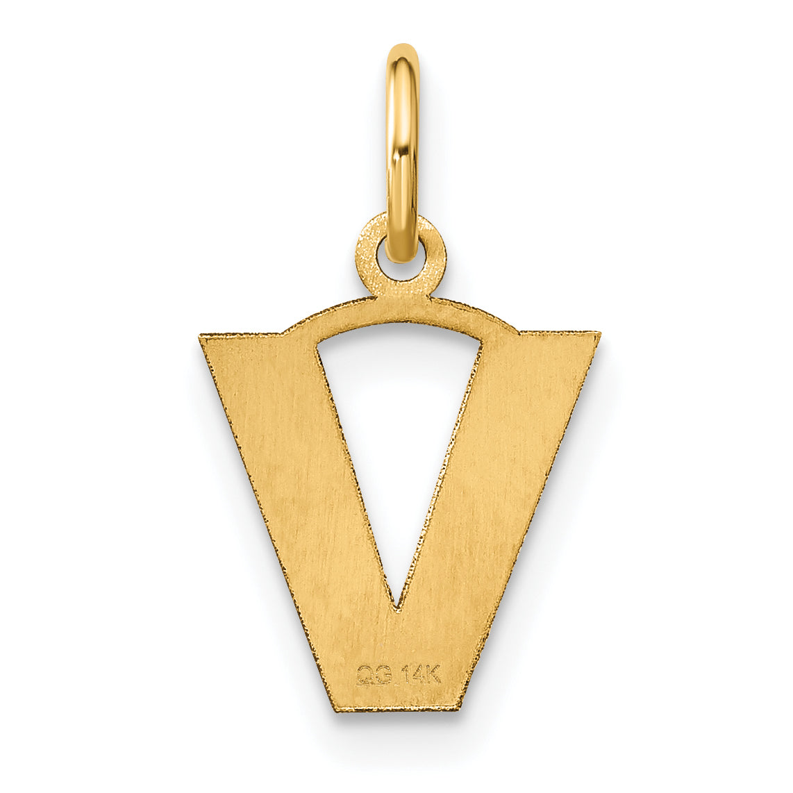 Introducing the stunning 14k Yellow Gold 14ky Letter V Initial Pendant. This beautiful piece shines in polished 14K yellow gold, showcasing a laser-cut design that truly stands out. Its large size and themed charm make it a perfect accessory for any outfit. Ideal for women who want to add a personal touch to their jewelry collection, this pendant serves as a meaningful gift or a special treat for yourself. Wear the 14k Yellow Gold 14ky Letter V Initial Pendant with pride and let your unique style shine through.