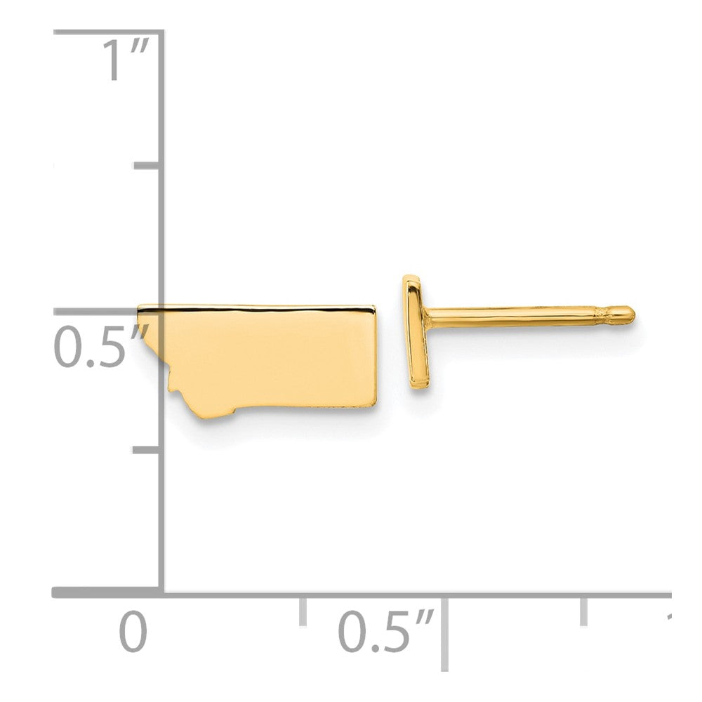The 14K Yellow Gold Montana State Earrings are a lovely way to show your love for the Big Sky State. Crafted from polished 14K gold, these earrings feature a tiny, detailed Montana map that adds a touch of charm. They measure just 6.03 mm long and 11.76 mm wide, making them perfect for daily wear. The button-style earrings have a secure post and push-back closure. Designed for women, these small earrings bring a subtle pop of gold and state pride. Handcrafted with care in Montana, the Montana State Earrings make a unique gift or personal keepsake.