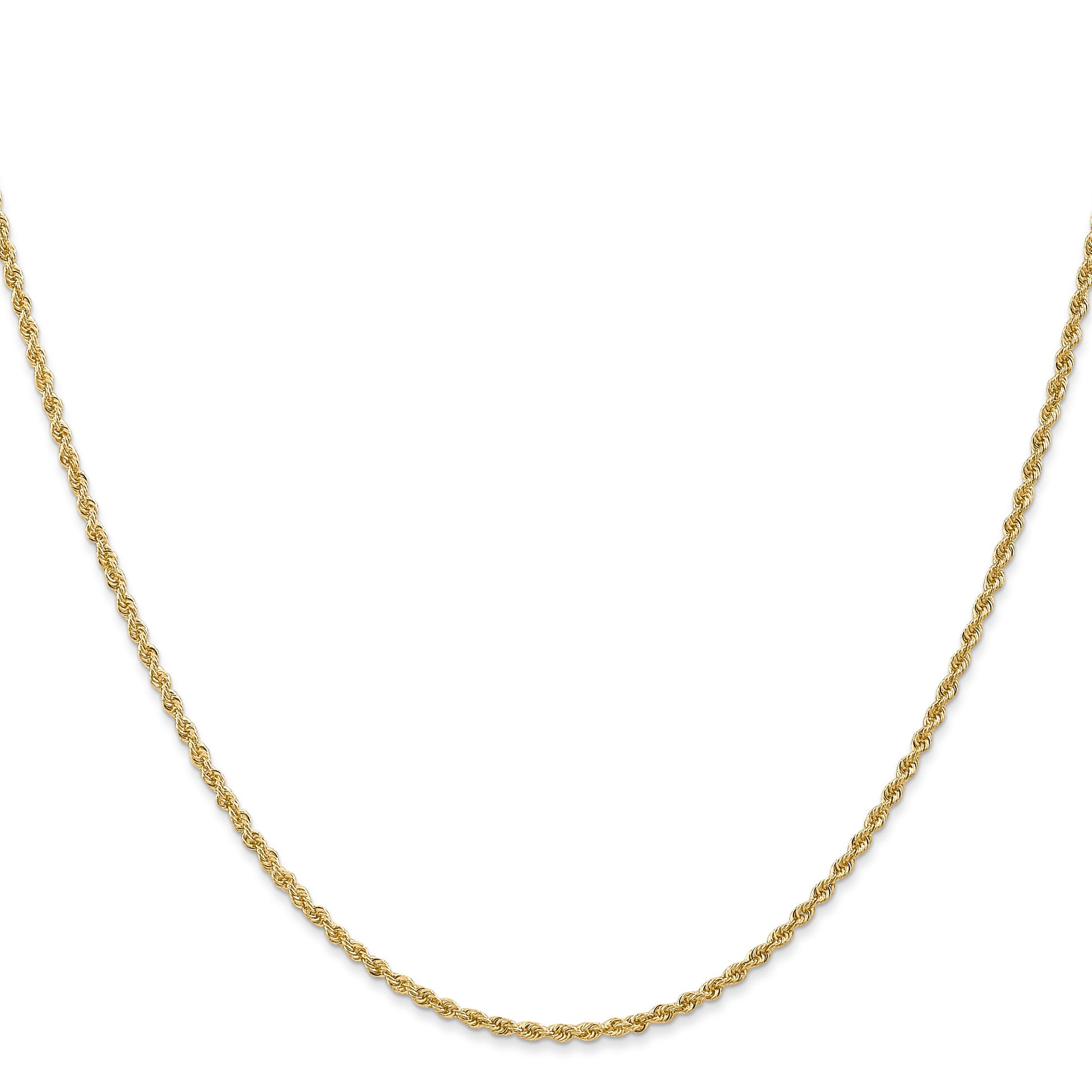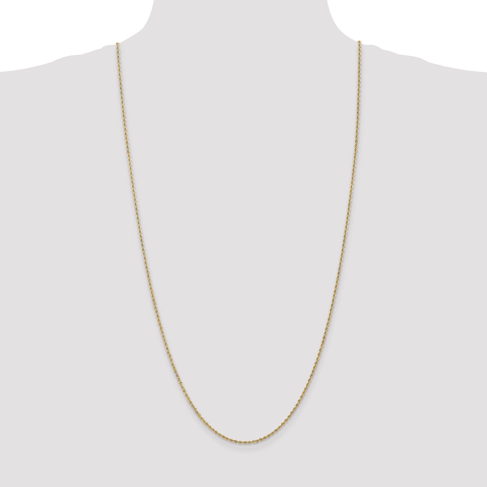 The 14K Yellow Gold 14K 1.6mm Solid Regular Rope Chain is a sleek piece of jewelry made of high-quality gold. Measuring 30 inches long, it offers a bold yet refined look. The polished finish gives it a bright shine that complements any outfit. Its sturdy lobster clasp ensures a secure fit every time. Crafted with solid gold and manufactured through extrusion, this chain boasts durability. Perfect for everyday wear, the 14K Yellow Gold 14K 1.6mm Solid Regular Rope Chain comes with a lifetime guarantee, making it a timeless addition to your jewelry collection.