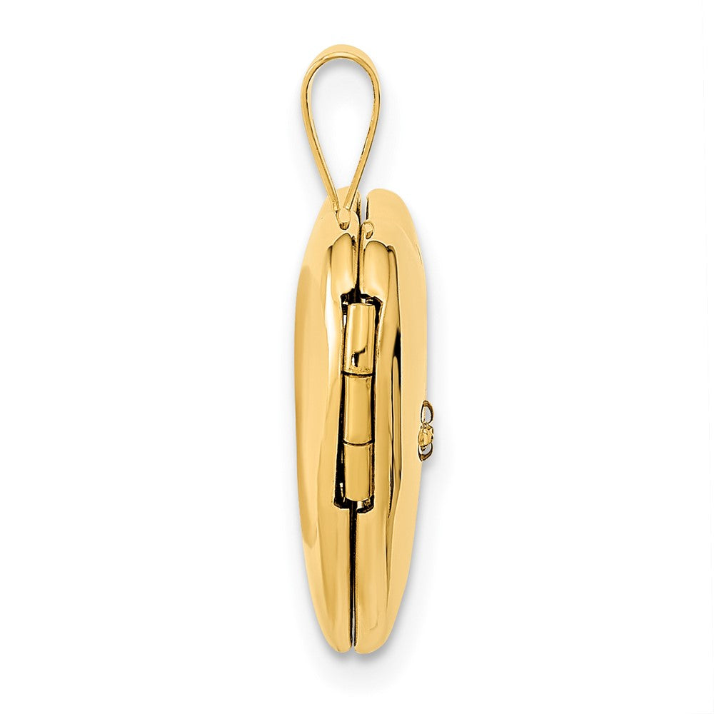 Discover the beauty of the 14K Yellow Gold 16mm With .01Ct. Diamond Star Heart Locket. Crafted from polished 14K gold, this charming piece features a shimmering white diamond and a delicate heart shape. The locket measures 21.5 mm in length and 16.1 mm wide, offering enough space to hold 2-10 mm heart-shaped photos. Its hollow design adds a touch of elegance, while the engravable surface allows for a personal touch. The locket's polished back and open clasp make it easy to wear and admire daily. Perfect for those who cherish their keepsakes, the 14K Yellow Gold With .01Ct. Diamond Star Heart Locket combines style with sentiment.