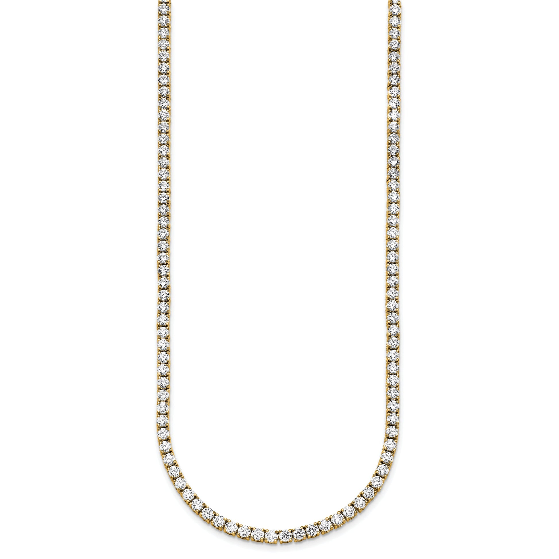 The 14K Yellow Gold 17 7/8 Carat Lab Grown Diamond Vs+ F+ Complete Round 24 Inch Straight Tennis Necklace is a stunning piece that catches the eye instantly. Crafted from high-quality gold, it features 185 lab-grown diamonds with a total weight of 17.87 carats, all set in a sleek and polished design. The diamonds shine in bright white F+ color and VS+ clarity, ensuring brilliance from every angle. The 24-inch chain offers a comfortable fit, perfect for making a statement. This jewelry piece is durable and crafted with safety in mind, thanks to its sturdy box catch clasp. Ideal for those who love style and value, the necklace offers elegance and confidence in one brilliant package.