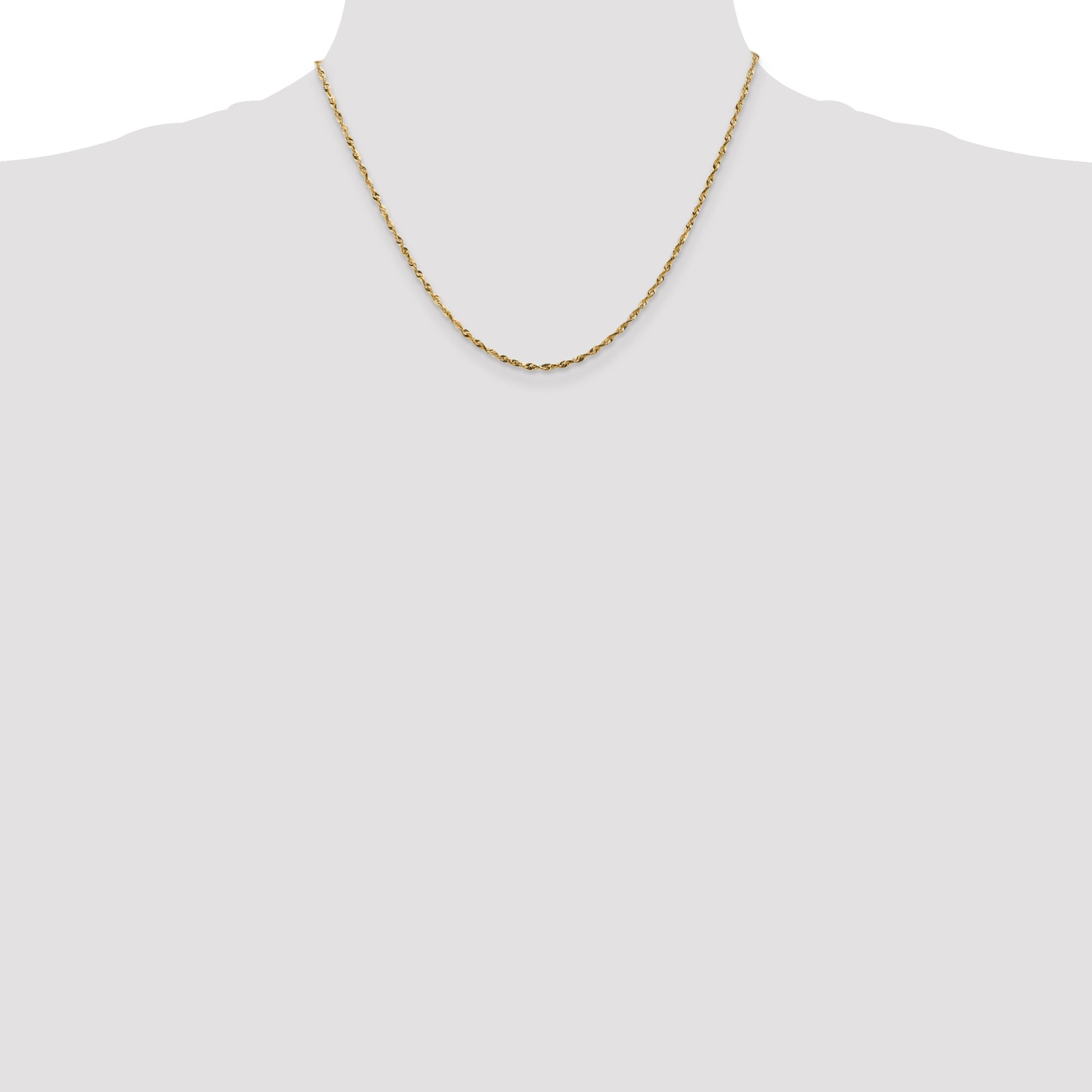Introducing the stunning 14K Yellow Gold 18 Inch Extra Light Diamond-Cut Rope Chain with a Lobster Clasp. Crafted from 14K polished gold, this 18-inch necklace showcases a beautiful 1.8mm diamond-cut rope design. The solid yet lightweight construction ensures comfort and a luxurious feel. Equipped with a secure lobster clasp, this exquisite piece is perfect for daily wear or special occasions. Elevate your jewelry collection with the timeless beauty and elegance of this 14K Yellow Gold 18 Inch Extra Light Diamond-Cut Rope Chain.