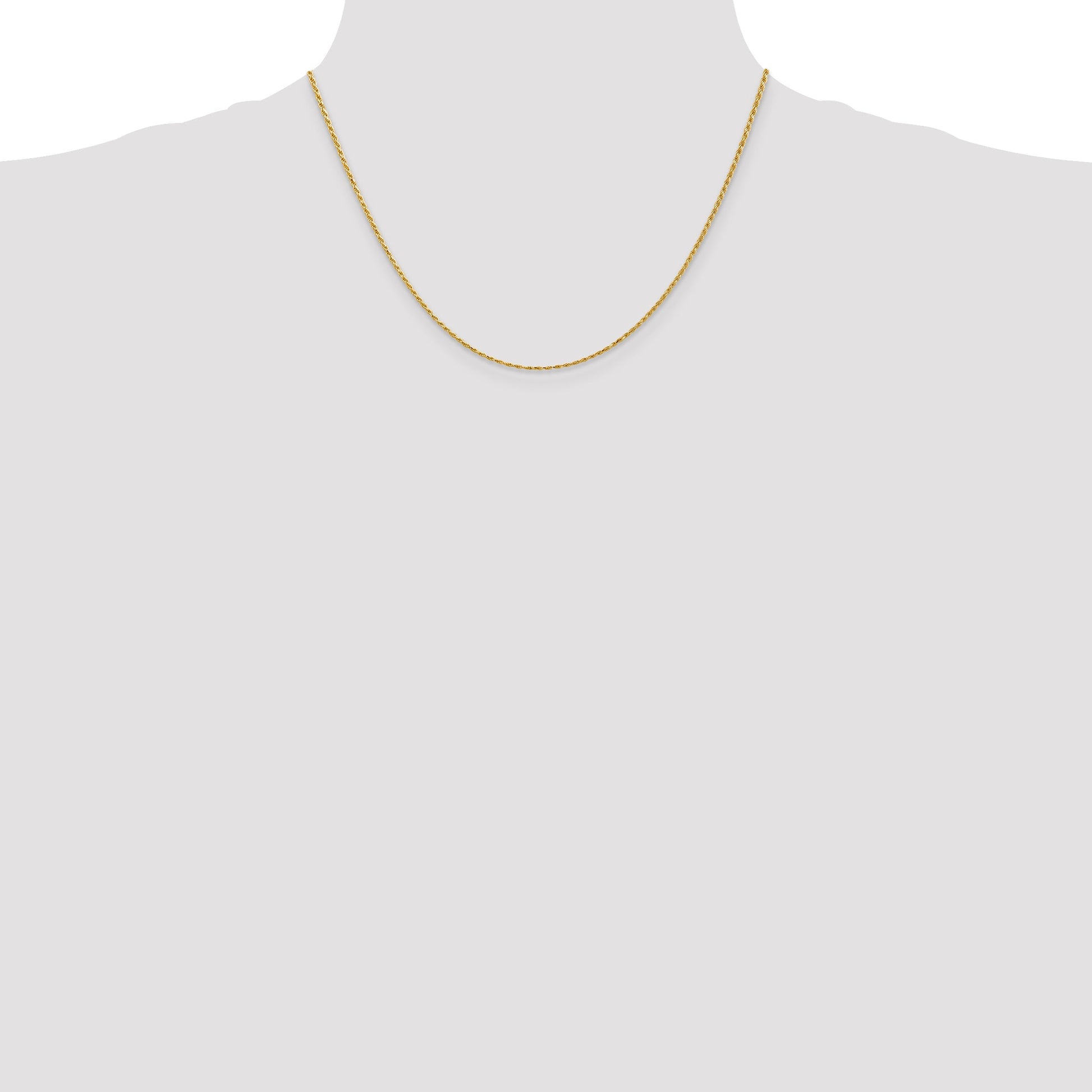 The 14K Yellow Gold 14K 18 Inch 1.3mm Diamond-Cut Solid Machine Made Rope With Lobster Clasp Chain is a sleek necklace designed for everyday wear. Its bright gold finish and diamond-cut details add a touch of shimmer and elegance. Made from solid 14K gold, the chain is durable and smooth to the touch, perfect for women who want a simple yet classy piece. The 18-inch length and 1.3mm width make it versatile to layer or wear alone. The lobster clasp ensures easy wearing and security. The 14K Yellow Gold 14K 18 Inch 1.3mm Diamond-Cut Solid Machine Made Rope With Lobster Clasp Chain makes a timeless addition to any jewelry collection.