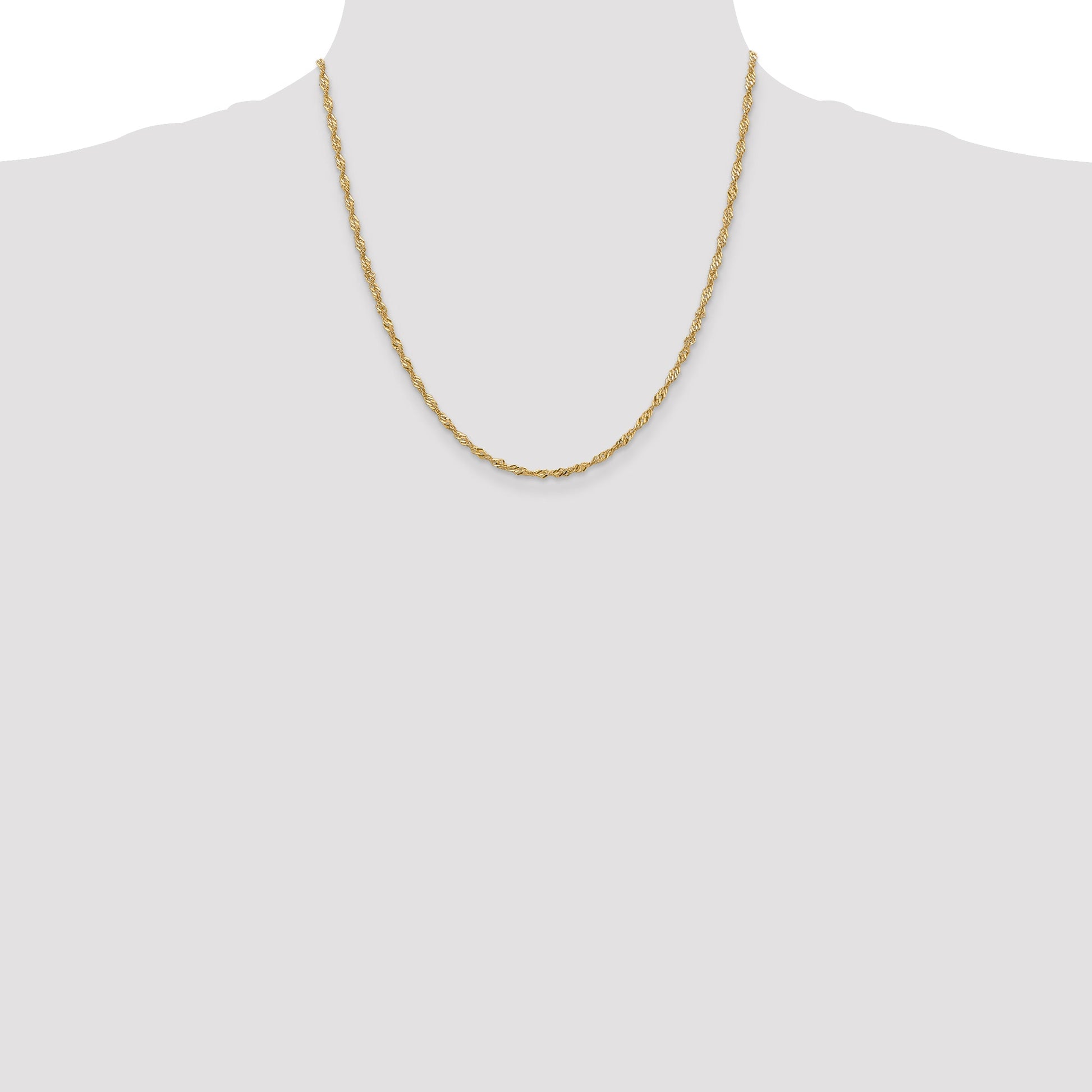 Discover the elegance of the 14K Yellow Gold 20 Inch 2mm Singapore Chain with a Lobster Clasp. This polished piece stands out with its intricate Singapore chain design, adding a dash of sophistication to any outfit. Crafted expertly through an extruding and die striking process, this chain promises durability without compromising style. The solid 14K gold ensures quality and luster that lasts. Measuring 20 inches in length and 2mm in width, it's designed for everyday elegance or special occasions. The lobster clasp offers ease and security, making this 14K Yellow Gold Singapore Chain a timeless addition to any jewelry collection.