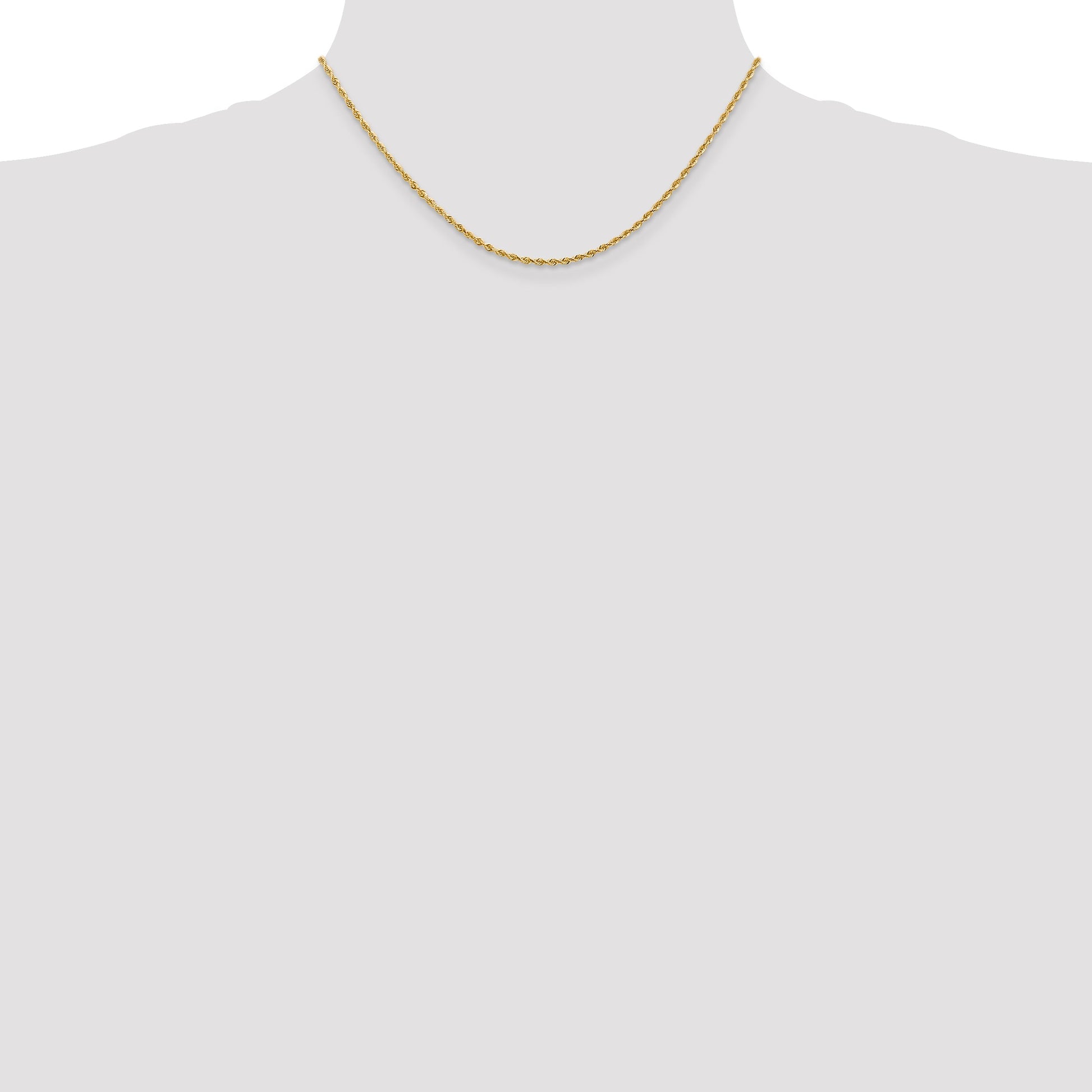 Discover the 14K Yellow Gold 2.00mm Diamond-Cut Lightweight Rope Chain, a sleek piece perfect for everyday wear. Crafted from solid 14K gold, it features a polished finish that catches the light beautifully. Measuring 16 inches long with a 2mm width, this chain offers a subtle yet stylish look. The diamond-cut texture adds extra sparkle, and the lobster clasp ensures it stays secure. Its lightweight design offers comfort without sacrificing style. The 14K Yellow Gold 2.00mm Diamond-Cut Lightweight Rope Chain comes with a lifetime guarantee, making it a reliable addition to your collection.