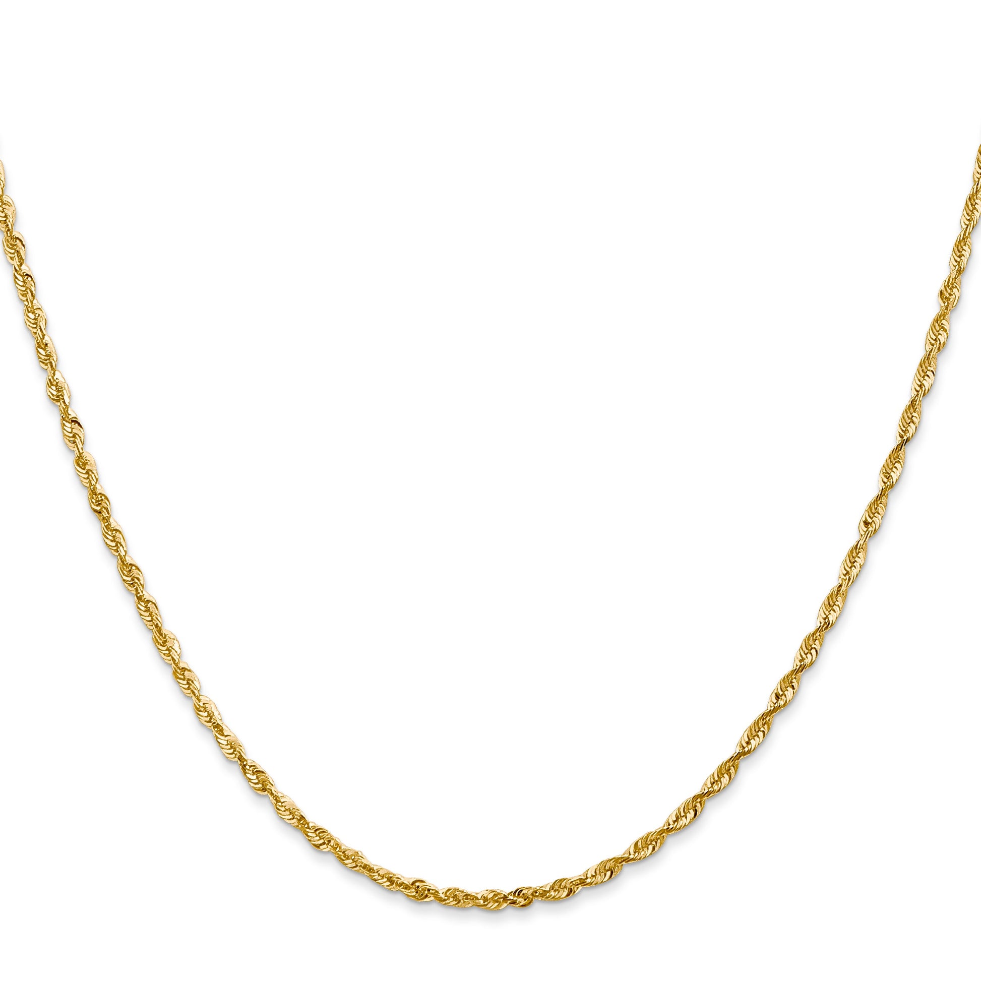Introducing the elegant 14K Yellow Gold 22 Inch 2mm Extra Light Diamond-Cut Rope With Lobster Clasp Chain, crafted to perfection for discerning tastes. This polished rope chain catches the light with its exquisite diamond-cut design, making it a radiant addition to any jewelry collection. Measuring 22 inches in length and 2mm in width, it balances delicacy with durability. The secure lobster clasp ensures a dependable fit, making it a versatile piece for daily wear. Relish in the luxury of this dazzling 14K Yellow Gold 22 Inch 2mm Extra Light Diamond-Cut Rope With Lobster Clasp Chain, designed to stand the test of time.