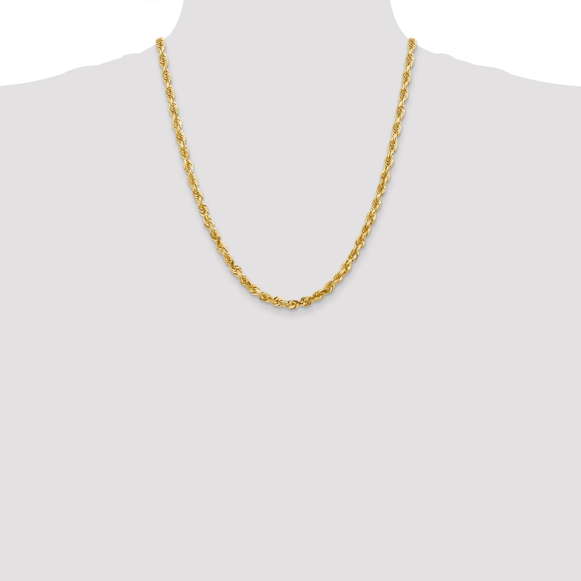 The 14K Yellow Gold 22-Inch 5mm Diamond-Cut Quadruple Rope Lobster Clasp Chain is a true classic. Crafted from 14-karat gold, it boasts a timeless polished finish. Its solid, 5mm diamond-cut rope design shimmers with every move. The 22-inch length offers a versatile fit that's perfect for any neckline. A sturdy lobster clasp ensures security while adding a touch of elegance. Unisex in its design, this chain is an exquisite piece made to be worn by anyone who appreciates fine craftsmanship. Make a statement with the 14K Yellow Gold 22-Inch Diamond-Cut Quadruple Rope Chain.