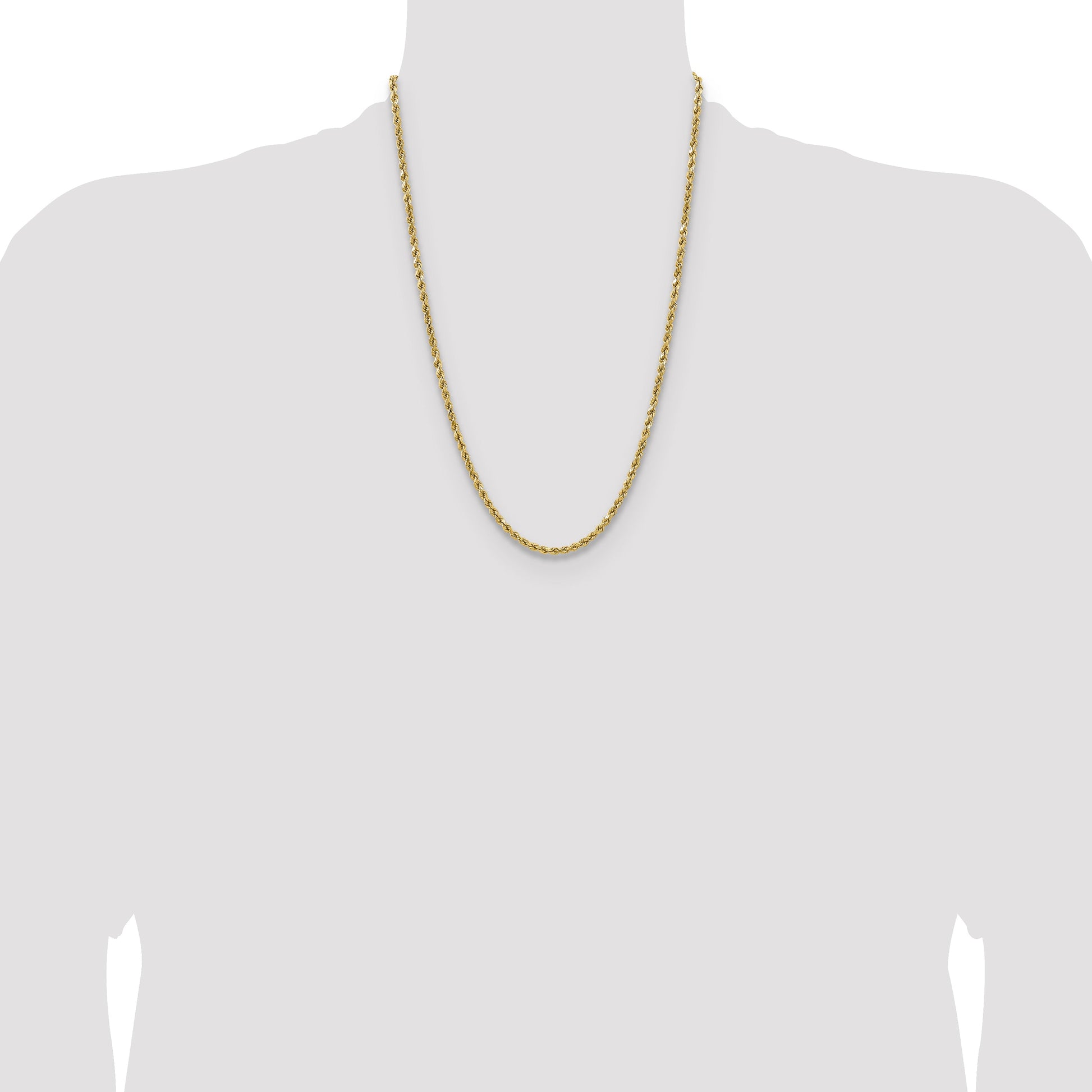 Discover the elegance of our 14K Yellow Gold 24 Inch 3.5mm Semi Solid Diamond-Cut Rope Chain. This polished beauty stands out with its intricate rope design and diamond-cut texture, offering a brilliant shine. The 24-inch length and 3.5mm width make it the perfect statement piece. Secured with a durable lobster clasp, this necklace promises both style and safety. Ideal for any occasion, this yellow gold chain adds a touch of luxury to any outfit. Elevate your jewelry collection with the 14K Yellow Gold 24 Inch 3.5mm Semi Solid Diamond-Cut Rope Chain.
