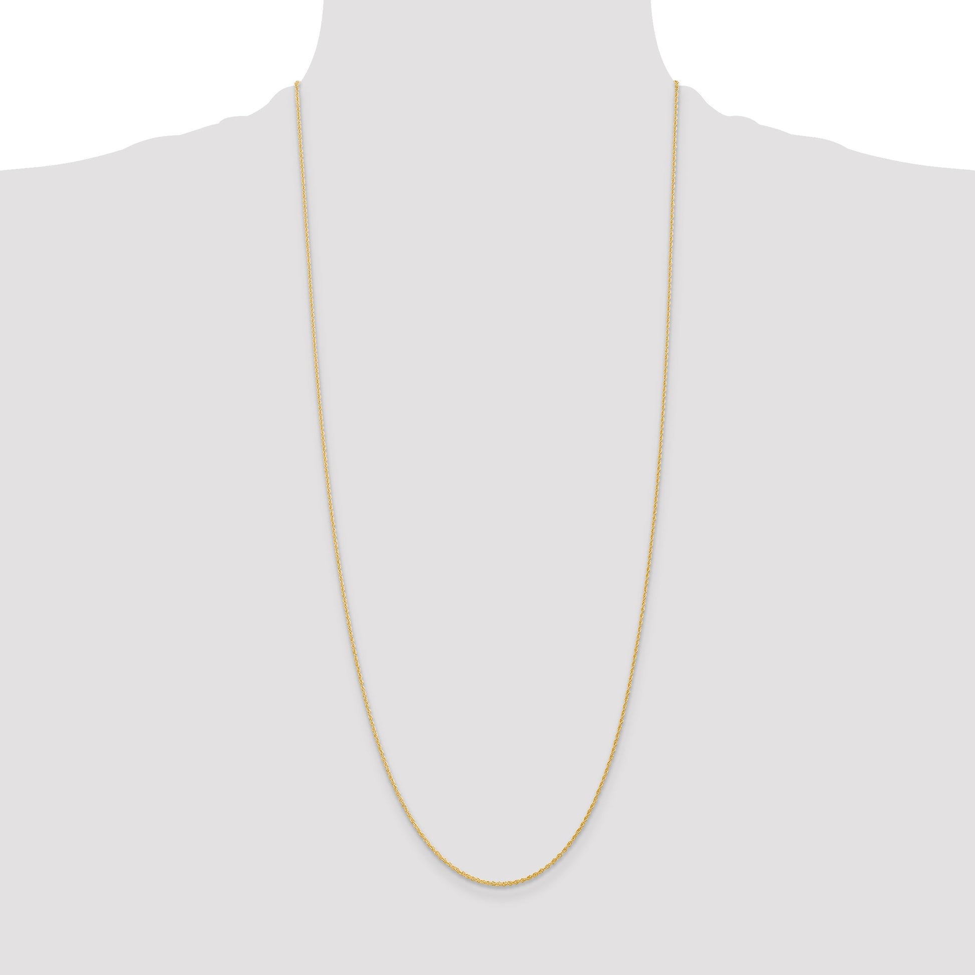 The 14K Yellow Gold 30 Inch 1.1mm Baby Rope Chain radiates elegance with its polished finish. This necklace suits any look, adding a touch of sophistication. Its rope design reflects luxury, and the 14K gold gives it a timeless appeal. The chain, measuring 30 inches, drapes gracefully, making it perfect for layering or wearing alone. Secure it with ease using the spring ring clasp. Meticulously machine-made, this solid gold chain is crafted for durability. Ideal for everyday wear or special occasions, the 14K Yellow Gold 30 Inch 1.1mm Baby Rope Chain promises lasting style.