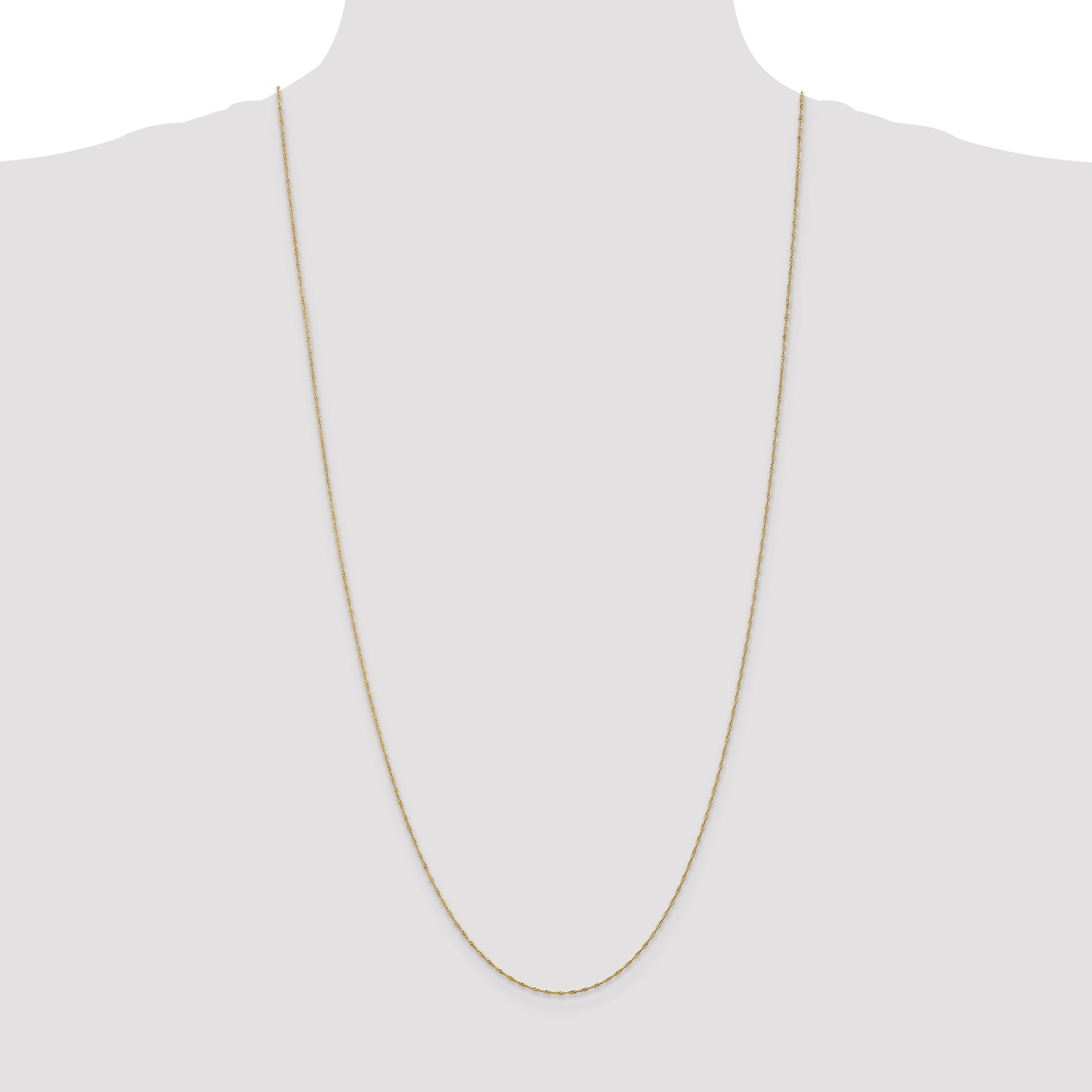 Elevate your style with this 14K Yellow Gold 30-Inch Singapore Chain Necklace. Its gleaming polished finish exudes refined allure. The chain's 1mm width beautifully accentuates its delicate grace. Crafted through a precise casting process, this machine-made chain is both solid and durable. Secured with a reliable spring ring clasp, it offers easy wearability and versatility. Perfect for those who appreciate intricate yet sturdy jewelry, this necklace is a testament to timeless elegance. The 14K Yellow Gold 30-Inch Singapore Chain Necklace is ideal for complementing any look, an exquisite touch to your ensemble.