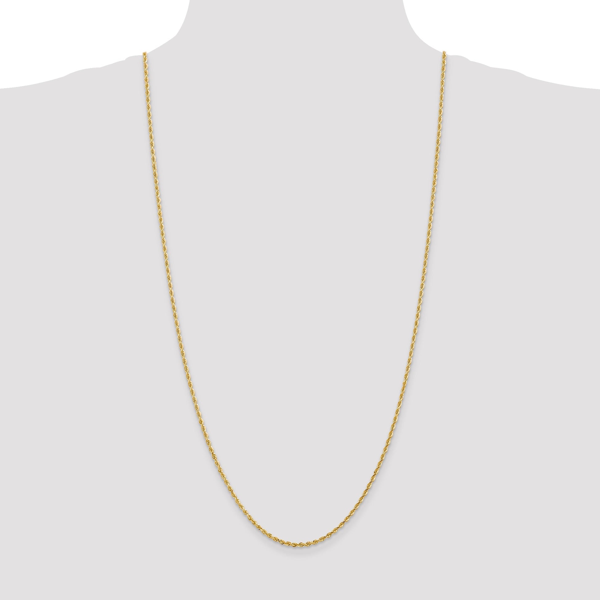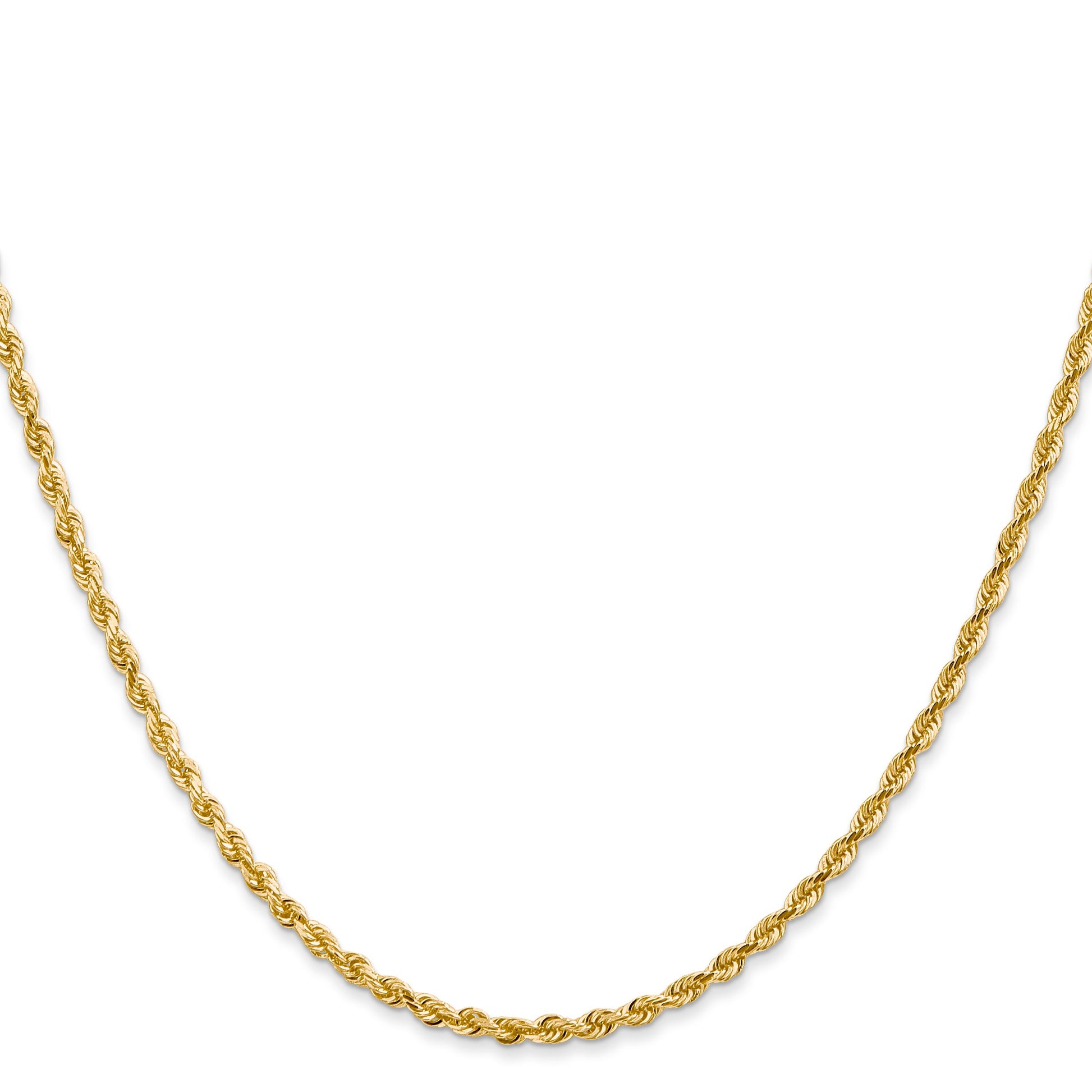 Unveil the elegance of the 14K Yellow Gold 30 Inch Diamond-Cut Quadruple Rope Chain. Crafted with precision, this piece shines with a polished finish that captures light from every angle. The 2.25mm width creates a bold yet refined silhouette, perfect for any occasion. The rope design adds texture, enhanced by an intricate diamond-cut pattern, offering a unique sparkle. The lobster clasp ensures security and ease of wear. This necklace, made of solid 14K gold, is designed for women who appreciate timeless style. The 14K Yellow Gold 30 Inch Chain is a true statement of luxury and class.