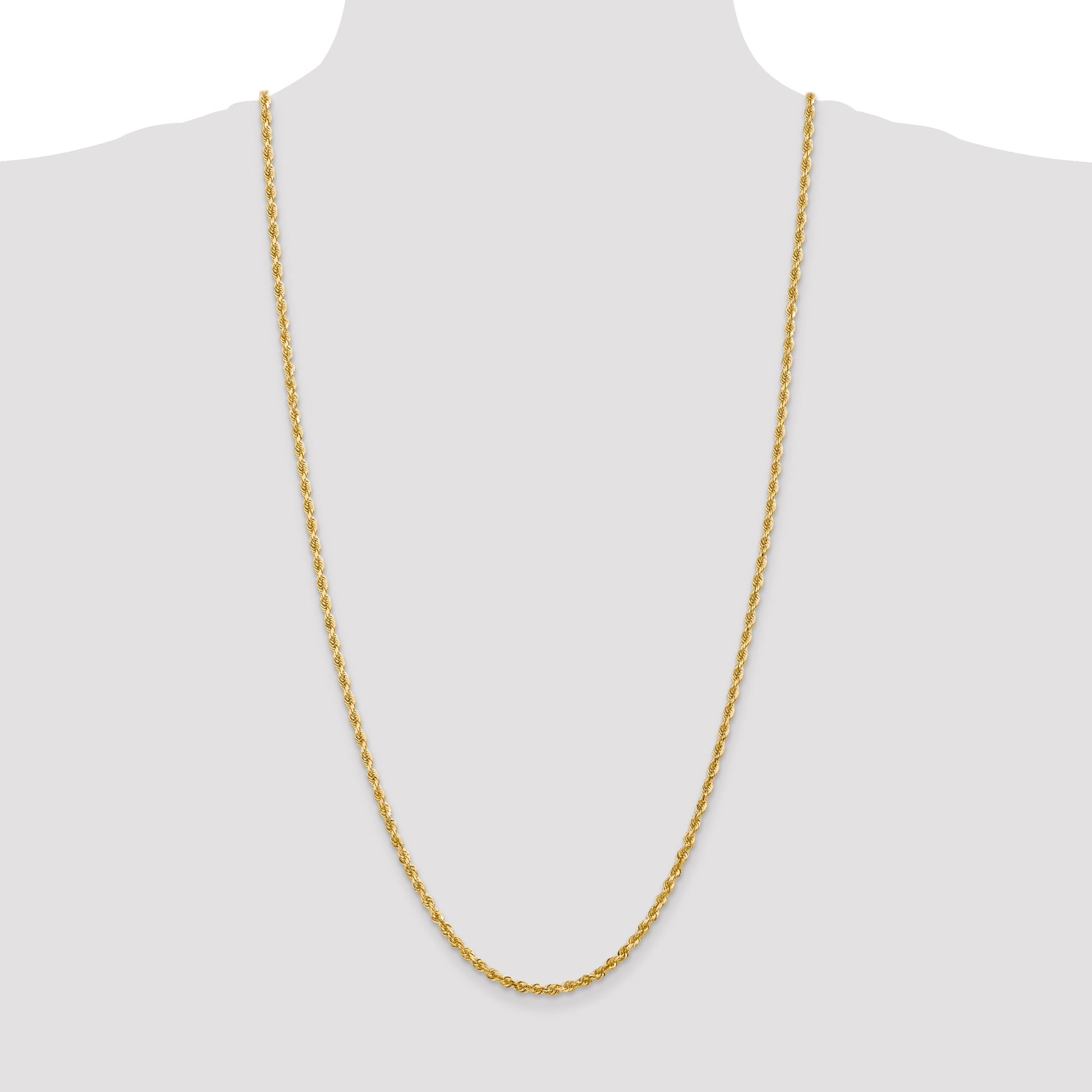 The 14K Yellow Gold 30 Inch 3.35mm Diamond-Cut Quadruple Rope Lobster Clasp Chain is a gorgeous piece of fine jewelry designed with elegance in mind. Crafted from solid 14K gold, this chain showcases a classic 30-inch rope design. The 3.35mm width makes a bold statement while maintaining a delicate feel. Its diamond-cut texture glimmers beautifully, capturing light from every angle. The secure lobster clasp ensures a safe wear, giving you peace of mind. Perfect for any occasion, the 14K Yellow Gold 30 Inch Diamond-Cut Quadruple Rope Chain adds undeniable charm to your look, making it a treasured addition to your collection.