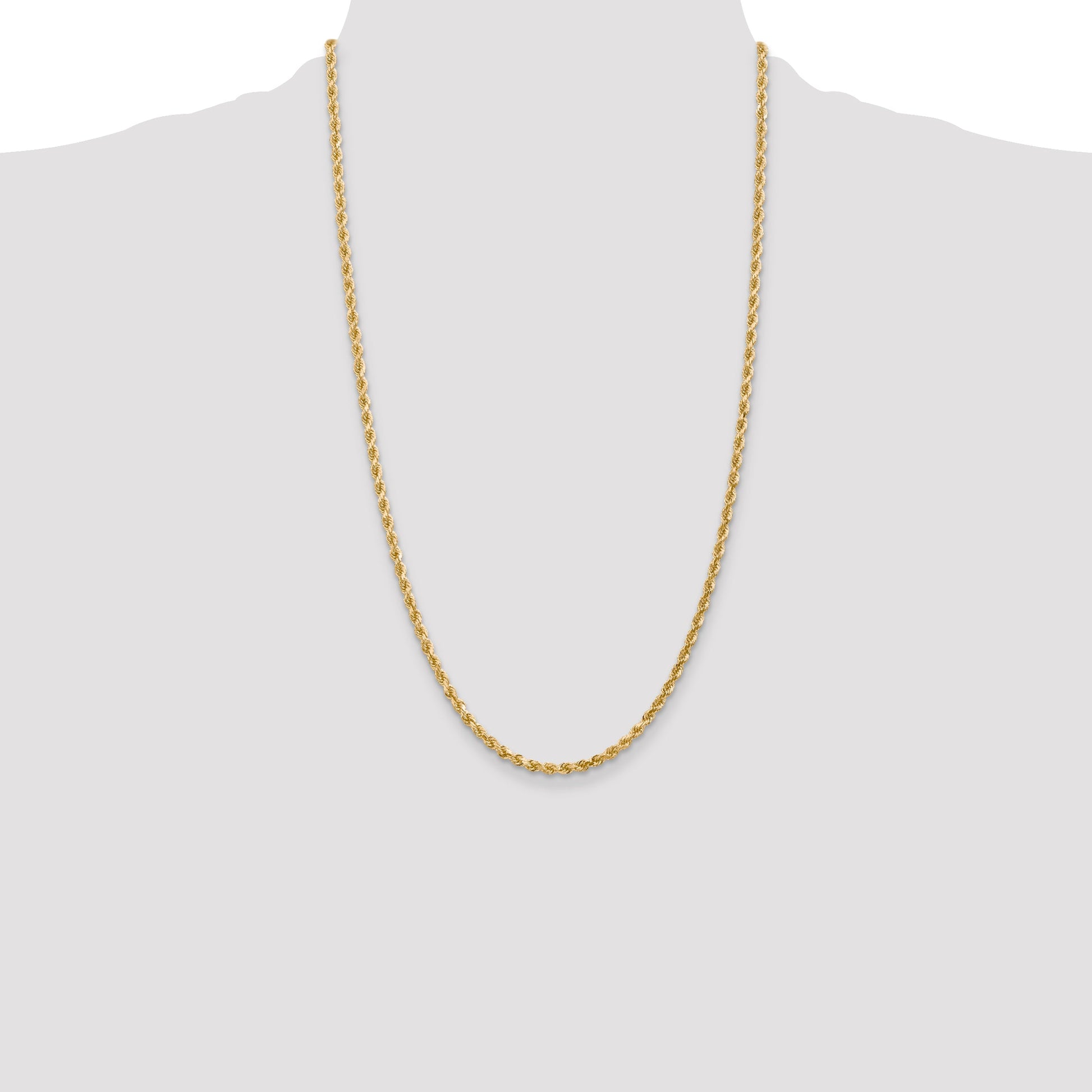 The 14K Yellow Gold 14K 3mm Diamond-Cut Rope Chain is a sleek addition to any jewelry collection. Crafted from high-quality 14K gold, this chain measures 26 inches long and features a bright polished finish. The diamond-cut texture adds a subtle sparkle that catches the eye. Its sturdy lobster clasp ensures a secure fit, making it perfect for daily wear. Made with precision through machine manufacturing, this chain offers a polished look and lasting durability. The 14K Yellow Gold 14K 3mm Diamond-Cut Rope Chain is a versatile piece that brings style and shine to any outfit, backed by a lifetime guarantee.
