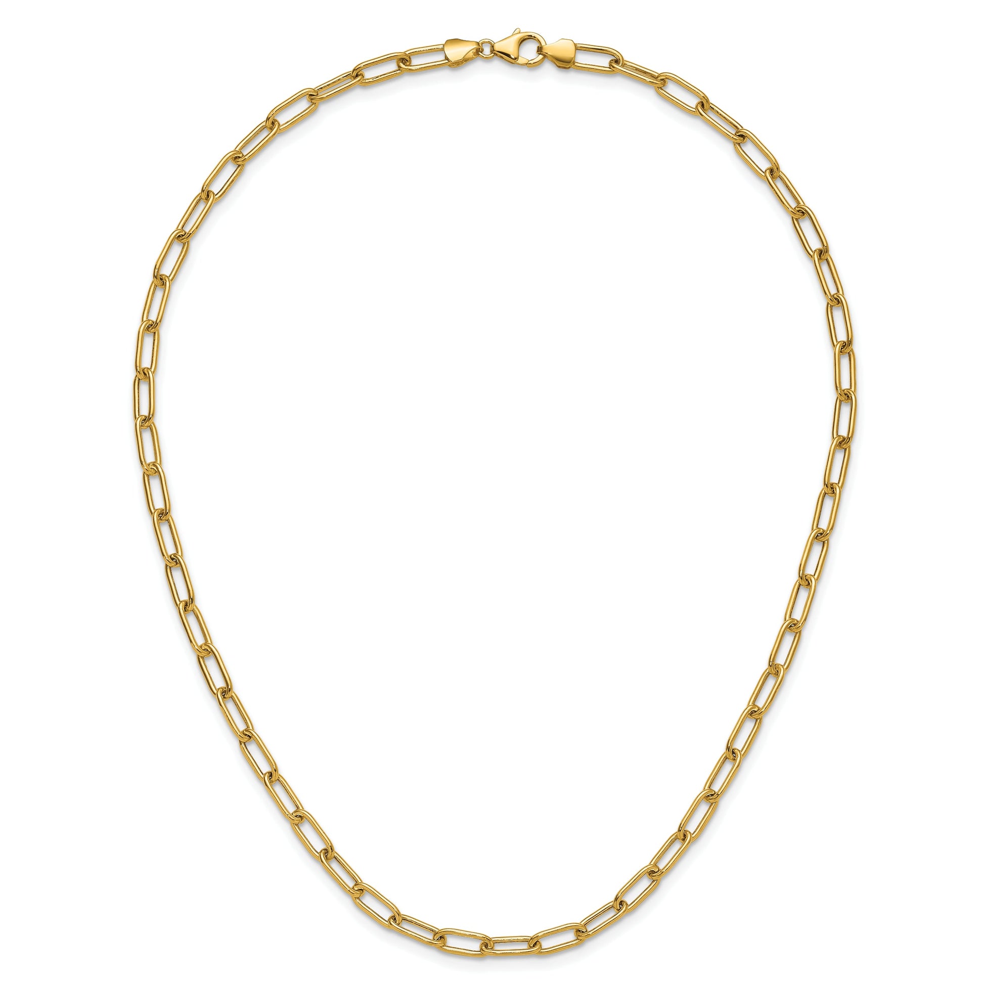 The 14K Yellow Gold 4.5mm Semi-Solid Paperclip Chain is a sleek addition to any wardrobe. Crafted from high-quality 14K gold, this necklace features a polished finish that shines brightly. Its 16-inch length makes it perfect for everyday wear, while the sturdy lobster clasp keeps it secure. The chain’s modern paperclip style adds a touch of fashion-forward flair. Lightweight yet durable, the 4.5mm width ensures comfort and durability. The jewelry piece is backed by a lifetime guarantee, making it a trusted choice. The 14K Yellow Gold 4.5mm Semi-Solid Paperclip Chain offers both style and lasting quality in one stunning package.