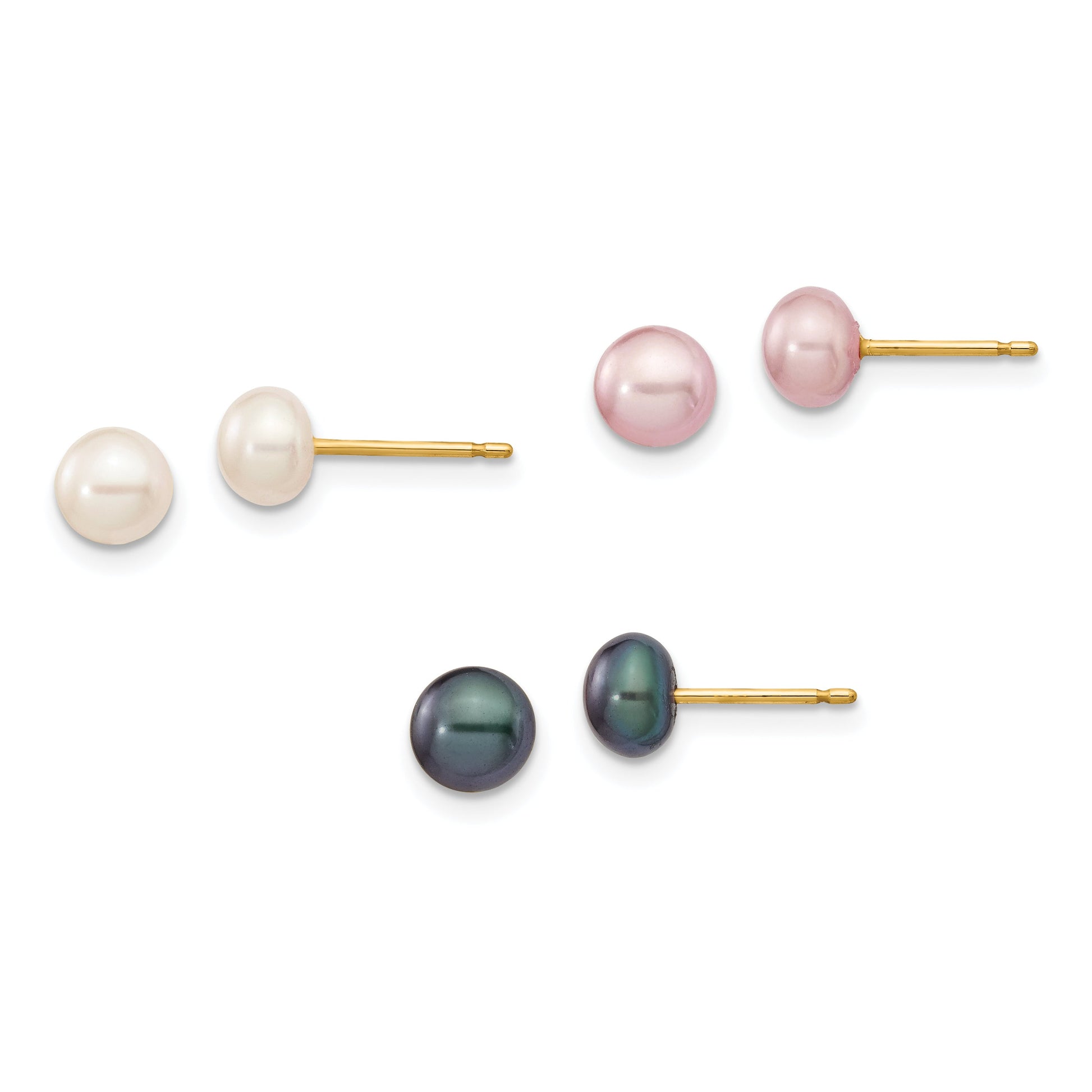 The 14K Yellow Gold 5-6mm Multicolor Button Freshwater Cultured Pearl Boxed 3 Pair Post Earrings Set offers a fresh, vibrant look for any woman. These earrings feature lustrous freshwater pearls in white, pink, and black, each carefully cultured for quality. The polished gold setting provides durability and shine, highlighting the rich, colorful pearls. Designed with easy post and push-back closures, these earrings are comfortable for daily wear. With the set of three, you get versatile options to match different outfits and moods. The elegant look of the 14K Gold Pearl Earrings set makes it perfect for gifting or adding a splash of color to your jewelry collection.