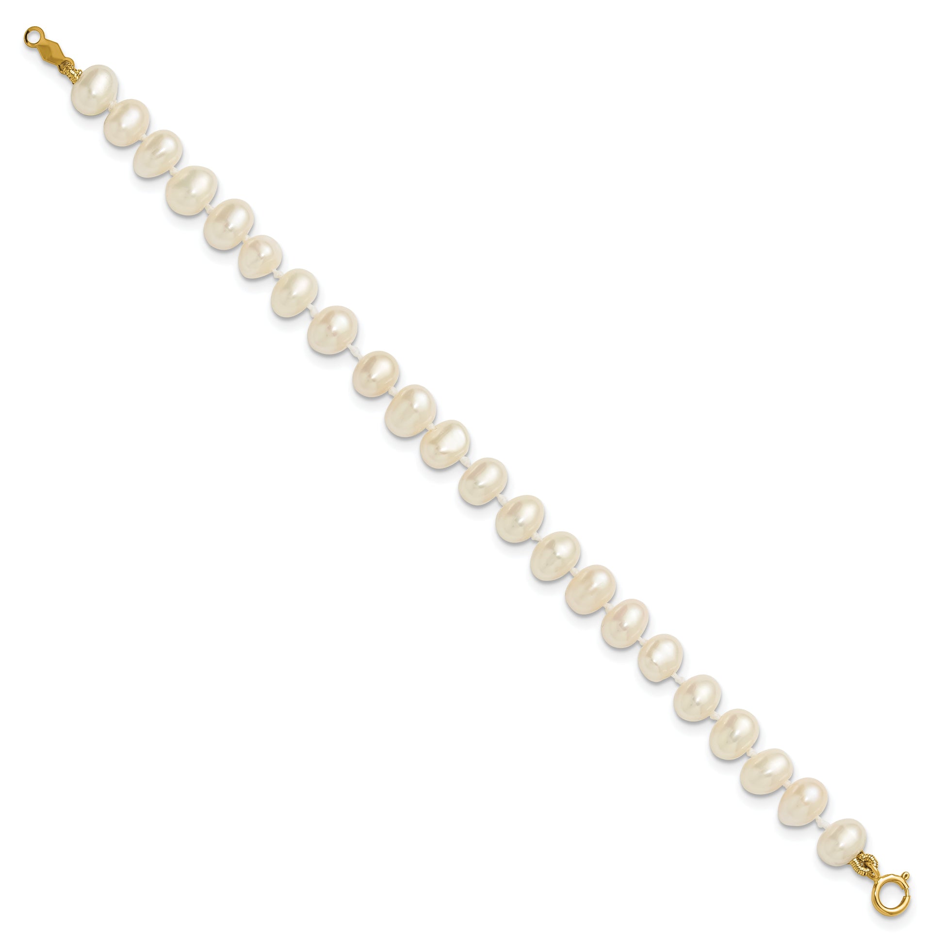 Introducing the 14K Yellow Gold 5-6mm White Semi-Round Freshwater Cultured Pearl Bracelet, a charming piece that blends elegance with simplicity. Crafted from polished 14K gold, this bracelet measures 5 inches long, making it perfect for a delicate fit on a girl's wrist. The bracelet features lustrous white freshwater pearls, each around 5 to 6mm, with a near-round shape to add a classic touch. A spring ring clasp ensures easy wear and security. The hollow design and stamping process give it a lightweight feel, making this jewelry piece both beautiful and comfortable. The 14K Yellow Gold 5-6mm White Semi-Round Freshwater Cultured Pearl Bracelet is a timeless addition that showcases natural beauty and fine craftsmanship.