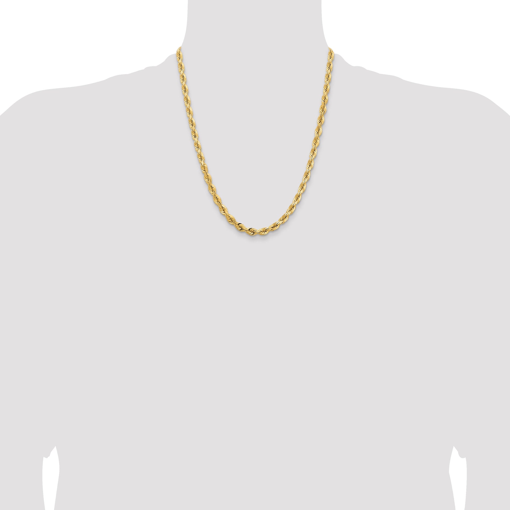 The 14K Yellow Gold 14K 5.5mm Diamond-Cut Rope Chain is a stylish choice for any jewelry lover. Crafted from high-quality 14K gold, this necklace shines with a polished finish and features a diamond-cut rope design that catches the light beautifully. With a length of 22 inches, it sits just right on the neck, making it versatile for different looks. The lobster clasp makes it easy to wear, and the durable machine-made build promises long-lasting wear. The 14K Yellow Gold 14K 5.5mm Diamond-Cut Rope Chain offers timeless style, backed by a lifetime guarantee.