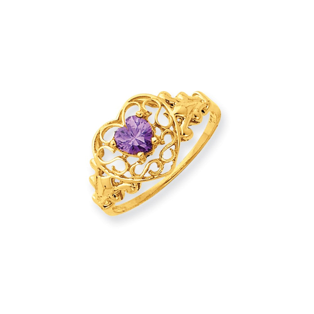This is a ring made of 14k yellow gold with a purple heart-shaped amethyst stone in the center. The ring weighs 1.75 grams and has a tapered band width of 1-6mm. The amethyst stone weighs 0.420 carats and is natural, meaning it has been heated but not created in a lab. The ring is 10mm long on the top and is a great choice for those born in February, as amethyst is the birthstone for that month.