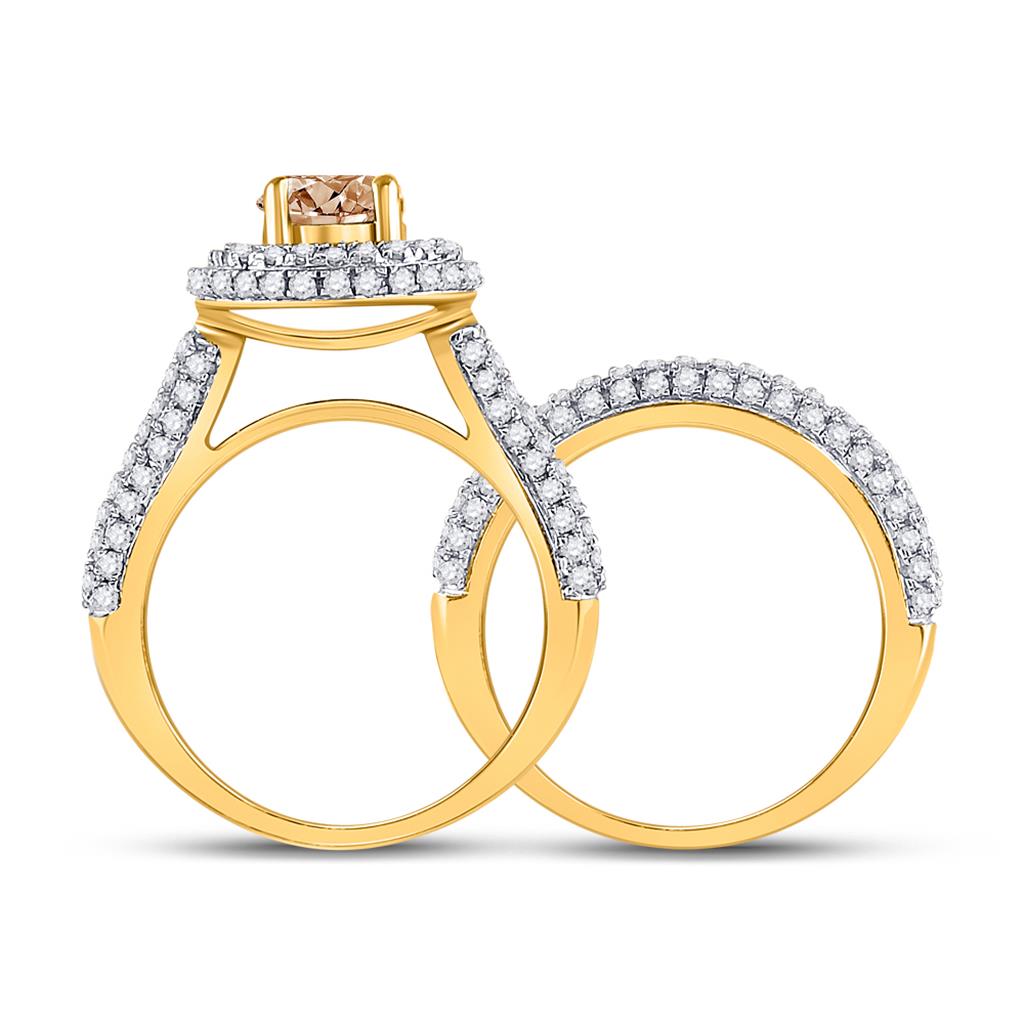 14k Yellow Gold Brown Diamond Halo Bridal Wedding Ring Set 2 Cttw