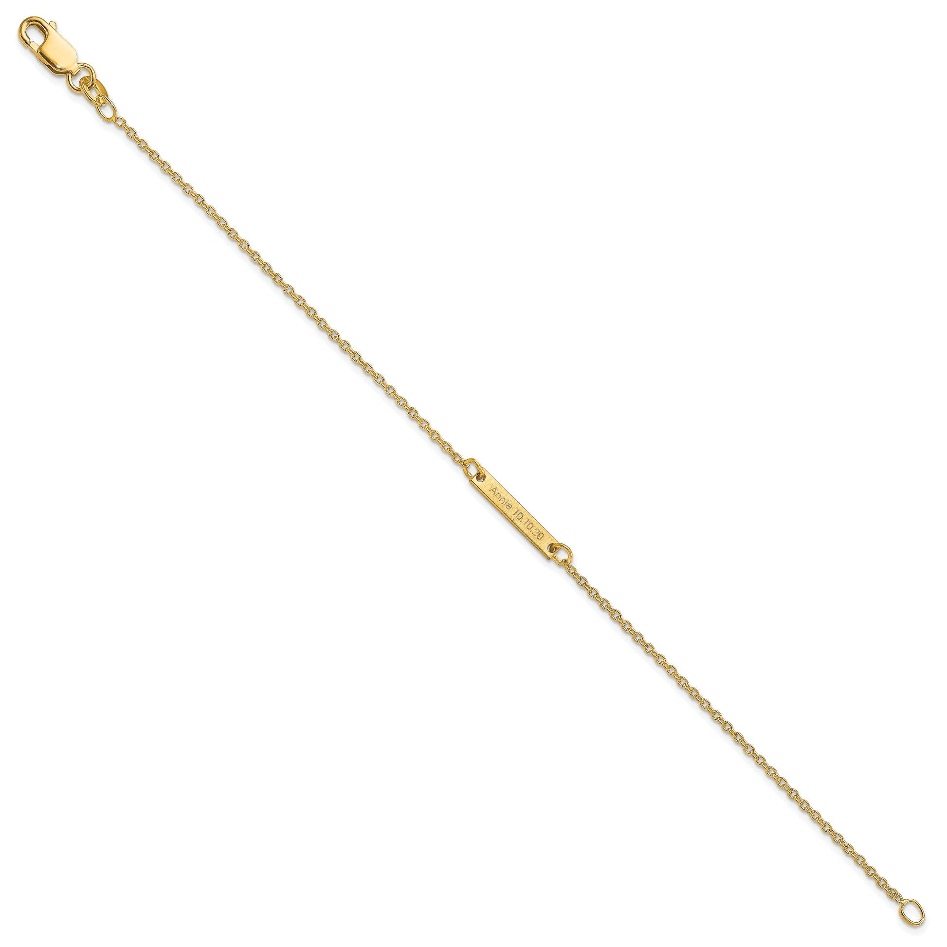 The 14K Yellow Gold Brushed 1 Station Bracelet is a sleek and stylish piece perfect for any woman. Made from high-quality 14K gold, it features a smooth brushed finish that adds a modern touch. The bracelet measures 7 inches long with a thin, 1mm cable chain that sits comfortably on the wrist. A simple lobster clasp keeps it secure. The standout feature is the personalized bar charm, measuring 14.98mm by 2.55mm, which allows for custom engravings. This elegant bracelet pairs well with everyday and special outfits, making it a versatile addition to any jewelry collection.