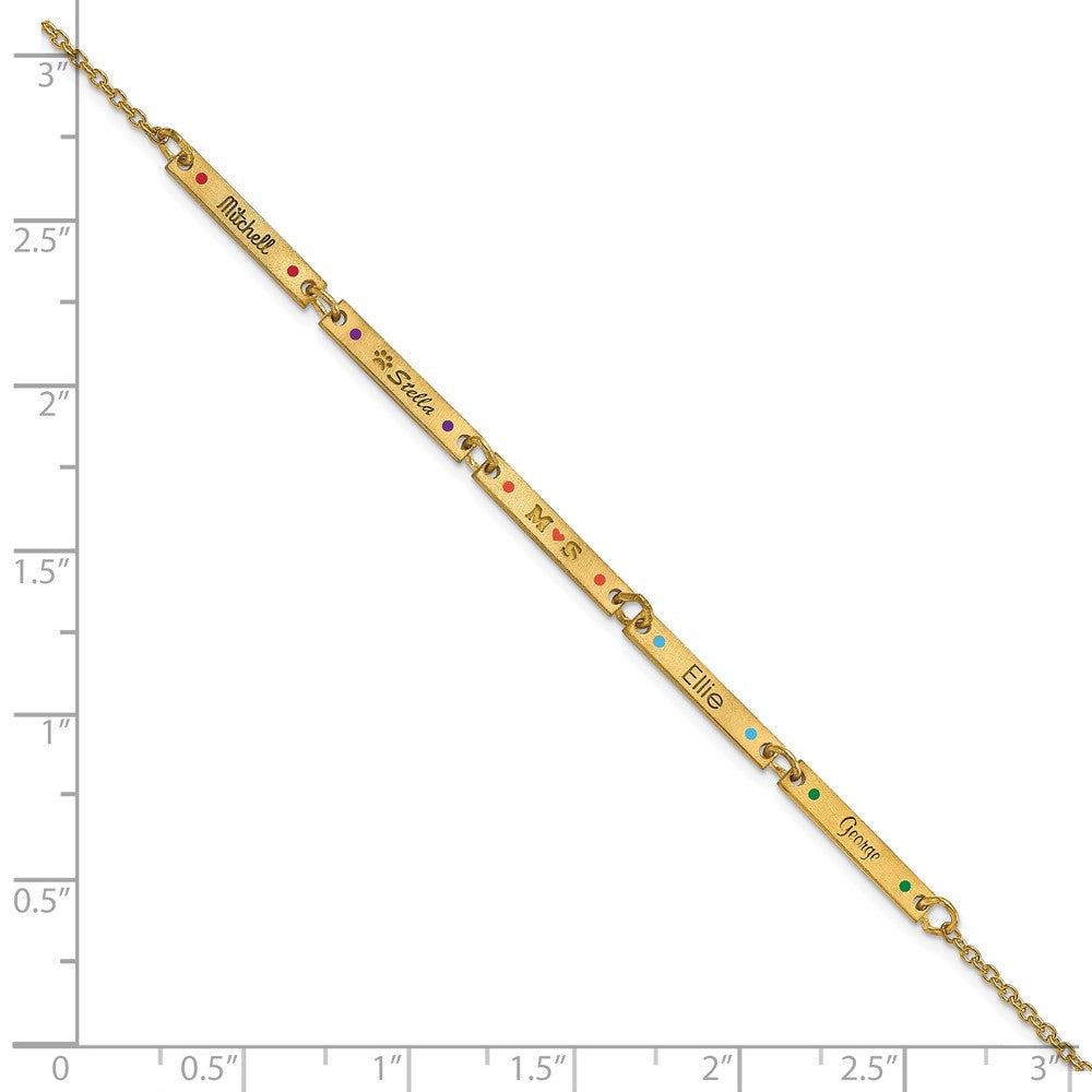 The 14K Yellow Gold Brushed 5 Station W/Epoxy Dots Bracelet offers a chic and personal touch to any woman’s jewelry collection. It features five stylish stations linked by a sleek cable chain, each accented with colorful epoxy dots for a pop of color. With a brushed finish, this bracelet adds a modern, soft shine, while its 7-inch length fits comfortably on most wrists. The lobster clasp ensures a secure fit. Crafted from high-quality gold, the 14K Yellow Gold Brushed 5 Station W/Epoxy Dots Bracelet is perfect for daily wear or special occasions, making a statement of elegance and fun.