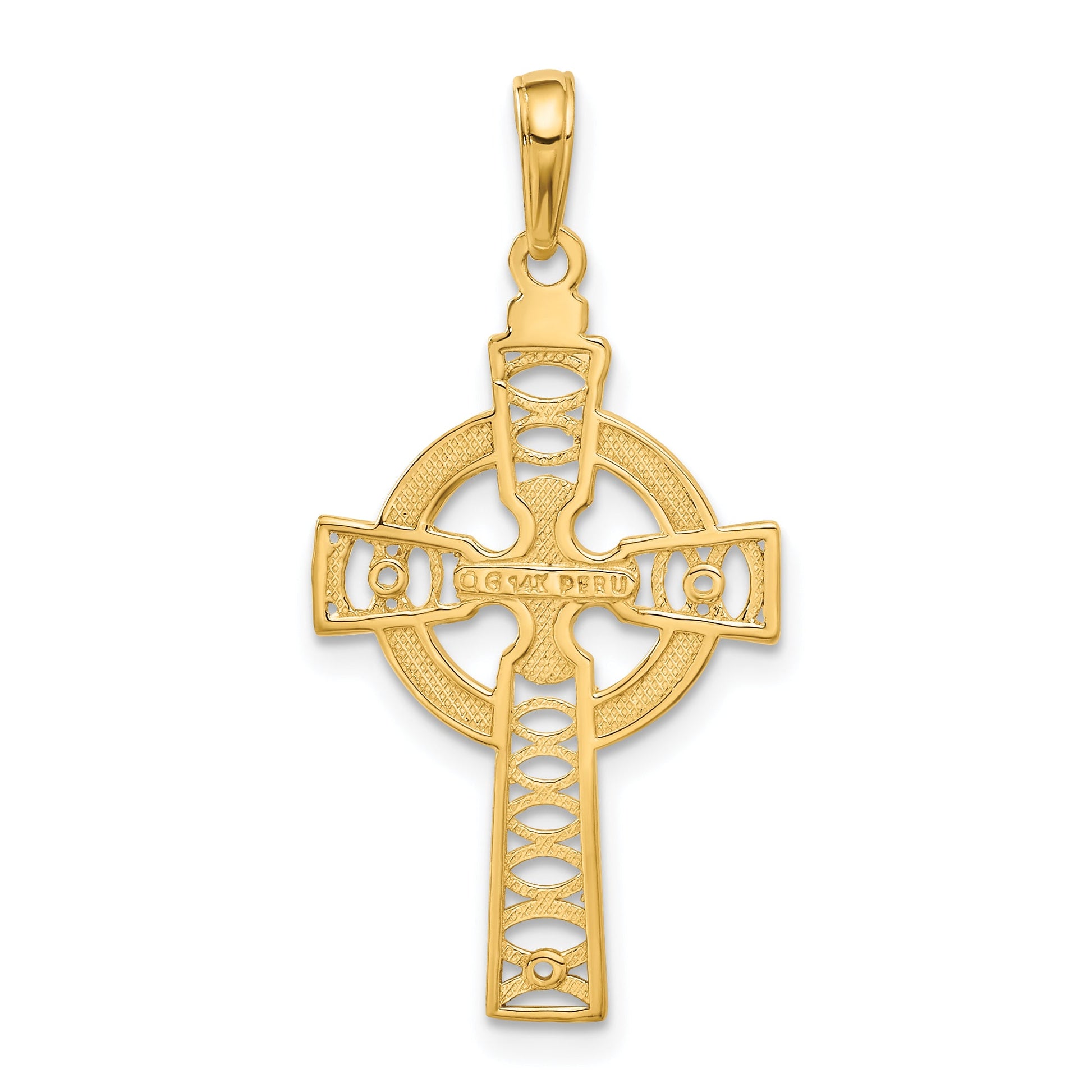 Introducing the exquisite 14K Yellow Gold Celtic Cross with Eternity Circle Pendant. Crafted from pure 14K gold, this stunning piece measures 36 mm in length and 18 mm in width. The intricate design features a solid Celtic Cross with an eternity circle, symbolizing timeless unity and faith. Each pendant is casted with precision to ensure quality and durability. This charming piece makes a perfect gift for loved ones or a meaningful addition to your jewelry collection. Embrace elegance with the 14K Yellow Gold Celtic Cross with Eternity Circle Pendant.