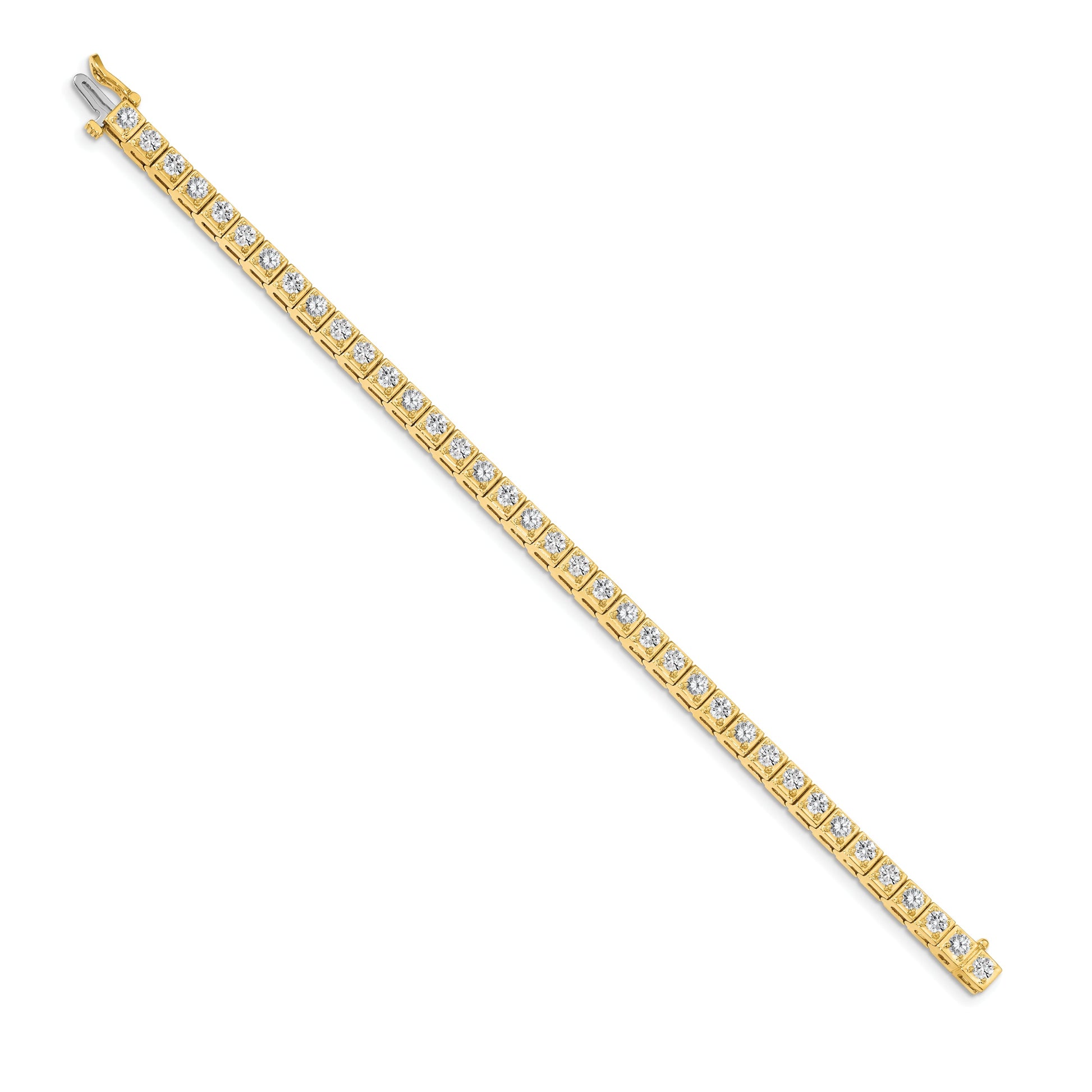 The 14K Yellow Gold Complete 3.75 Carat Round AA Diamond 4-Prong 7 Inch Tennis Bracelet shines with pure elegance. Crafted from polished gold, it features 37 stunning round diamonds with a total weight of 3.75 carats. The diamonds have a natural, faceted cut that adds extra sparkle, set securely in a four-prong design. Its solid construction includes a safety box clasp, ensuring it stays put. This stylish bracelet is perfect for women who want a touch of class. The 7-inch length fits comfortably, making the 14K Yellow Gold Complete 3.75 Carat Round AA Diamond 4-Prong 7 Inch Tennis Bracelet a must-have for any jewelry collection.