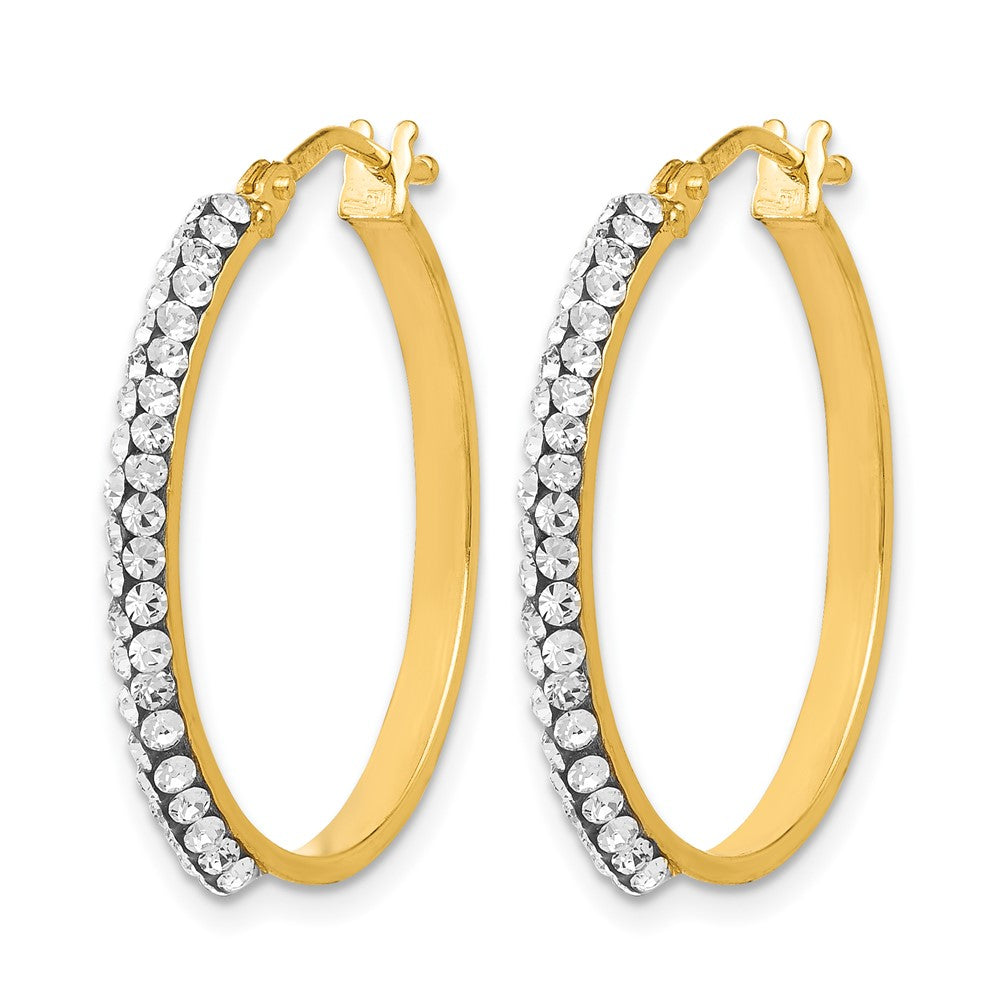 Discover timeless elegance with the 14K Yellow Gold Crystals from Swarovski Polished Hoop Earrings. Crafted with a lustrous finish, these earrings feature brilliant white Swarovski crystals that dazzle with every turn. Measuring 25mm in length and 8mm in width, their sleek design makes a statement while remaining lightweight and comfortable. The warm satin texture of yellow gold complements any outfit, enhancing your natural glow. Equipped with a reliable wire and clutch closure, these hoop earrings are suitable for everyday wear. Invest in sophistication and shine with these exquisite 14K Yellow Gold Crystals from Swarovski Polished Hoop Earrings.