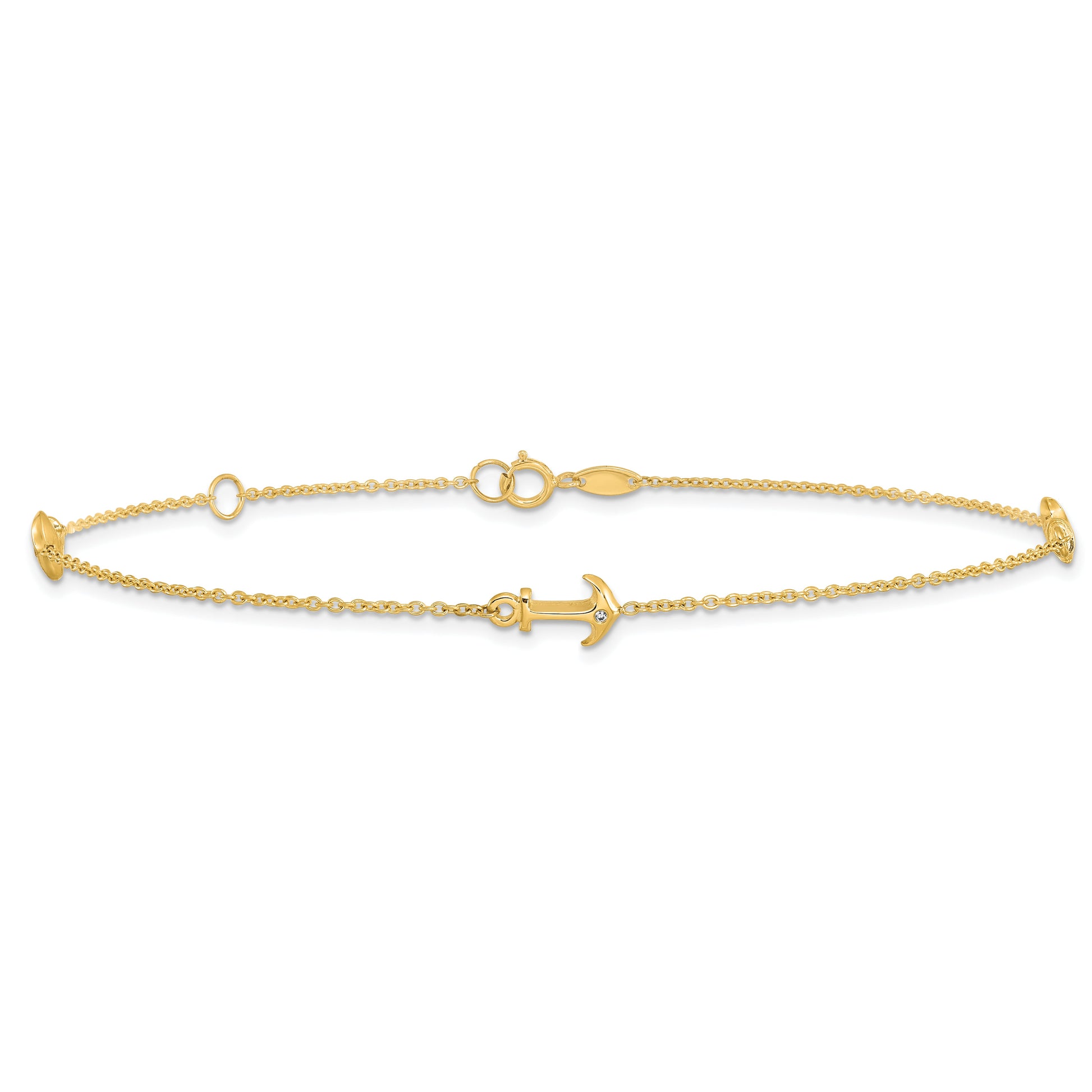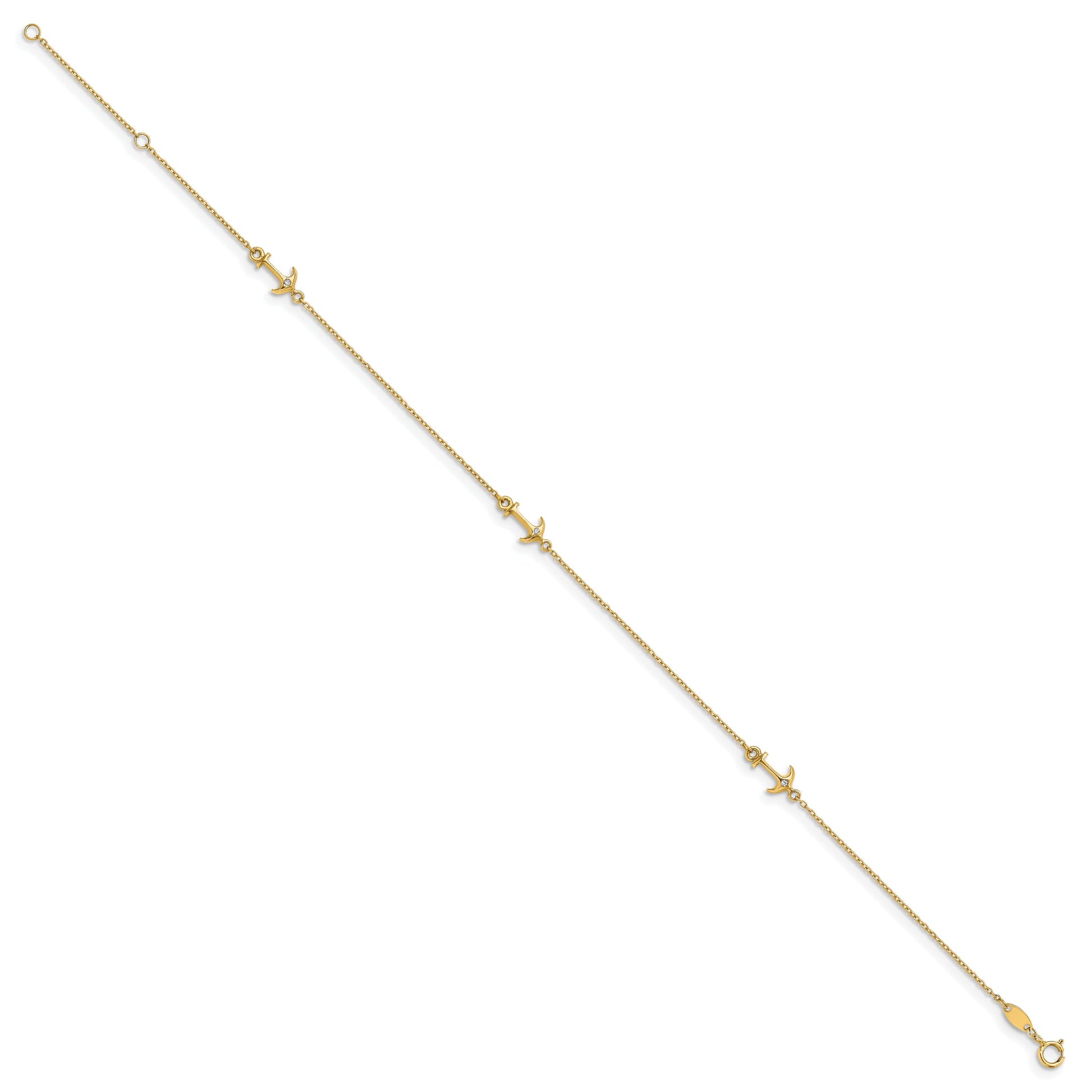The 14K Yellow Gold CZ Polished Anchor Anklet is a timeless piece for the modern woman. Crafted from solid 14K gold, this anklet features three sparkling cubic zirconia gems securely bezel-set, bringing a touch of sparkle to its polished design. The cable chain measures 9 inches in length, with an additional 1-inch extender for a customizable fit. Its sleek cable chain is 1 mm wide, allowing easy wear with its spring ring clasp. This anklet embodies elegance and durability, with a lifetime guarantee. Add grace to your jewelry collection with this exquisite 14K Yellow Gold CZ Polished Anchor Anklet.