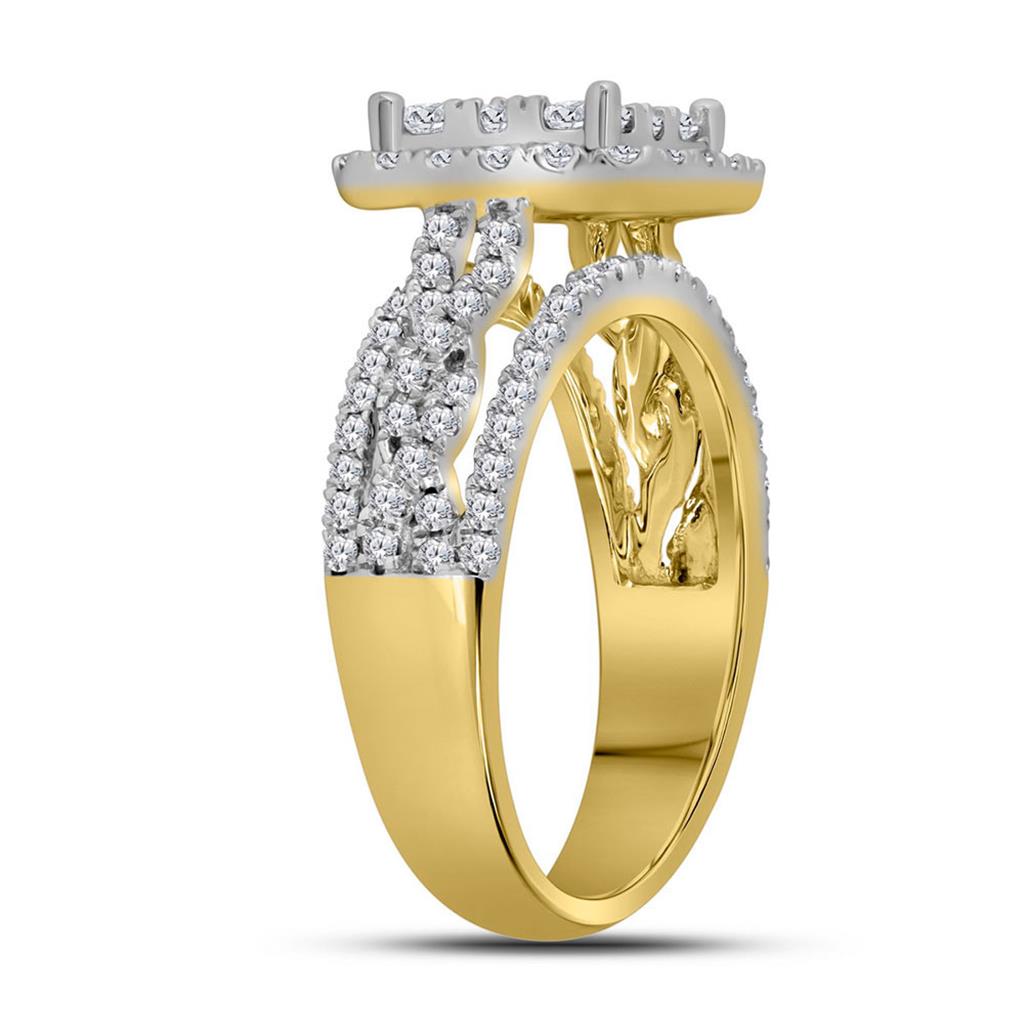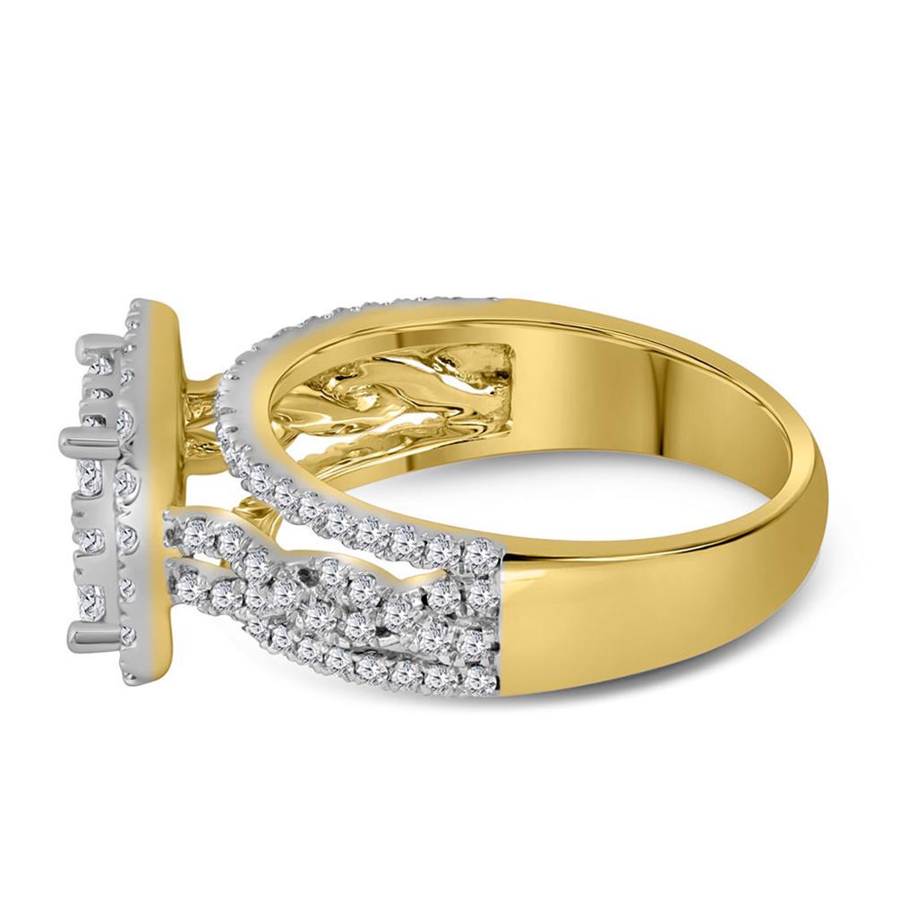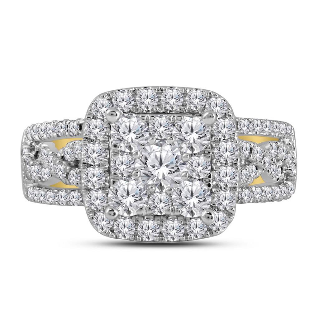The '14k Yellow Gold Diamond Bridal Engagement Ring 1-1/2 Cttw' is a stunning piece of jewelry that exudes elegance and sophistication. Crafted from 14kt yellow gold, this ring has a weight of approximately 6.41 grams. It features a total gemstone carat weight of 1 and 1/2, with the primary gem being a round-cut diamond of G-H color, SI3 clarity, and 4-prong setting, with a carat weight of 0.19. The second gemstone is also a round-cut diamond, with a carat weight of 0.15, and an I1-I2 clarity, G-H color, and a prong-set setting. The third gemstone is a round-cut diamond with a carat weight of 1.14, and an I1-I2 clarity, G-H color, and prong-set setting. This engagement ring is a beautiful and timeless piece that is sure to make any bride feel special on her special day.