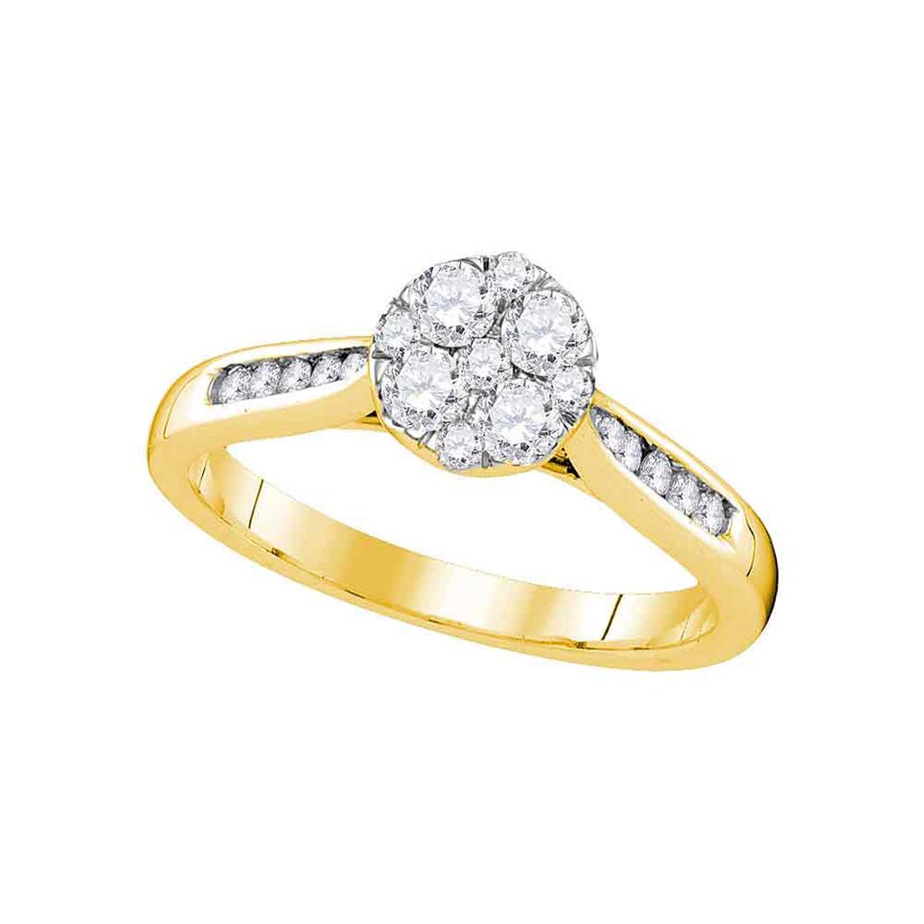 Crafted with the finest 14kt yellow gold, this stunning engagement ring showcases a total gemstone carat weight of 1/2. The primary gemstone is a round, sparkling diamond with a color grade of G-H and clarity grade of I2-I3. It is set in a beautiful cluster setting, while a channel-set round diamond weighing 0.15 carats enhances the design. This ring has an approximate gram weight of 3.1608 and is perfect for someone looking for a timeless and classic style. No third gemstone is included in this exquisite piece.