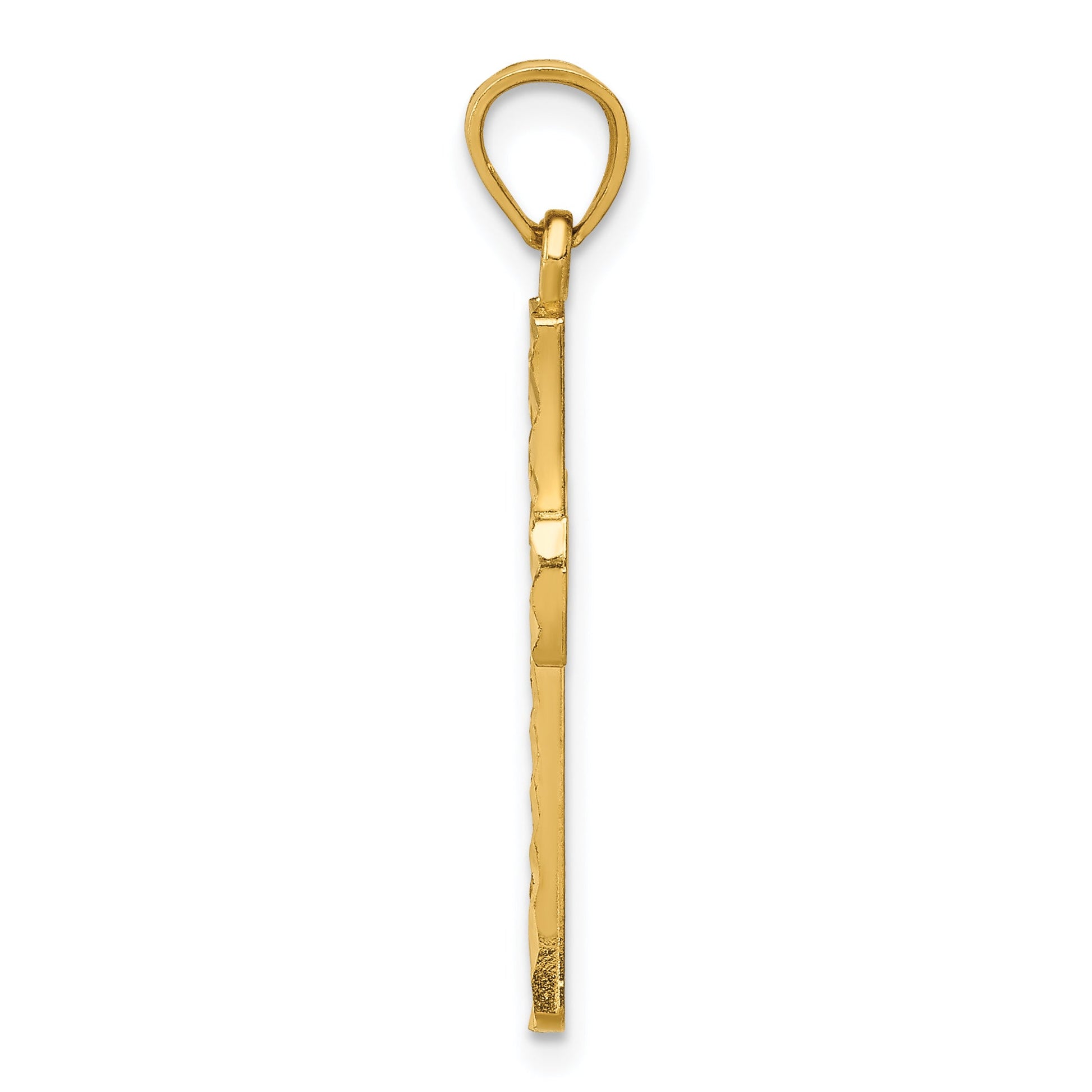 The 14K Yellow Gold Diamond-Cut Latin Cross Pendant is an elegant piece that embodies timeless grace. Crafted from 14K gold, the pendant boasts a polished finish that enhances its warm yellow hue. Its diamond-cut texture adds a unique sparkle, making it an eye-catching addition to any jewelry collection. The pendant, with a length of 38mm and a charm element measuring 24mm, provides a sturdy and solid feel. Whether worn daily or for special occasions, the 14K Yellow Gold Diamond-Cut Latin Cross Pendant promises to be a cherished keepsake.