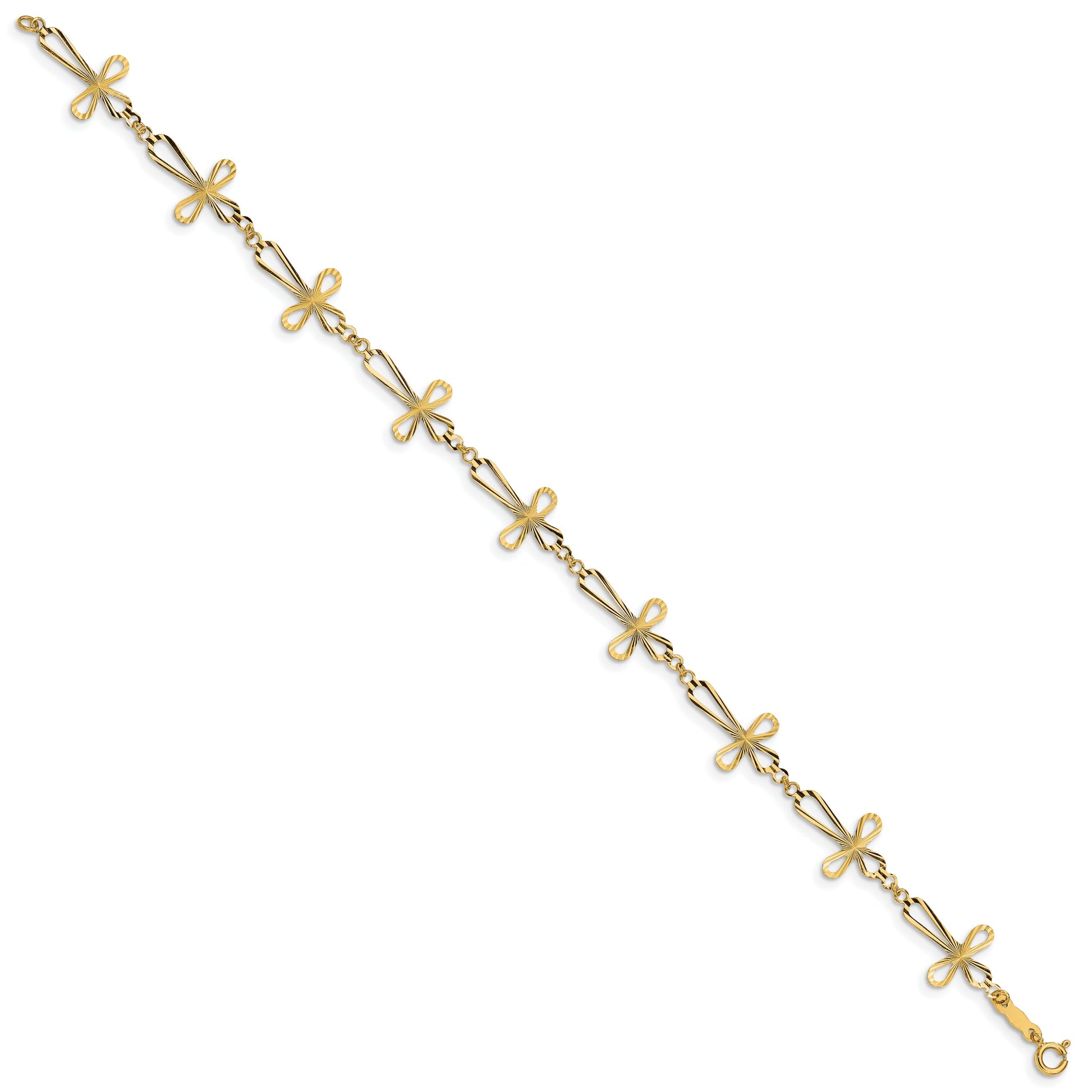 The 14K Yellow Gold Diamond Cut Open Cross Bracelet makes a stunning statement on any wrist. Crafted from pure 14K yellow gold, this bracelet boasts a length of 7.5 inches and features a striking 11 mm wide chain. Each bracelet station highlights a beautifully diamond-cut open cross, measuring 15 mm in length and 11 mm in width. The solid build from stamped gold ensures durability, while the spring ring clasp offers ease of use. Perfect for any occasion, the 14K Yellow Gold Diamond Cut Open Cross Bracelet exudes timeless elegance.