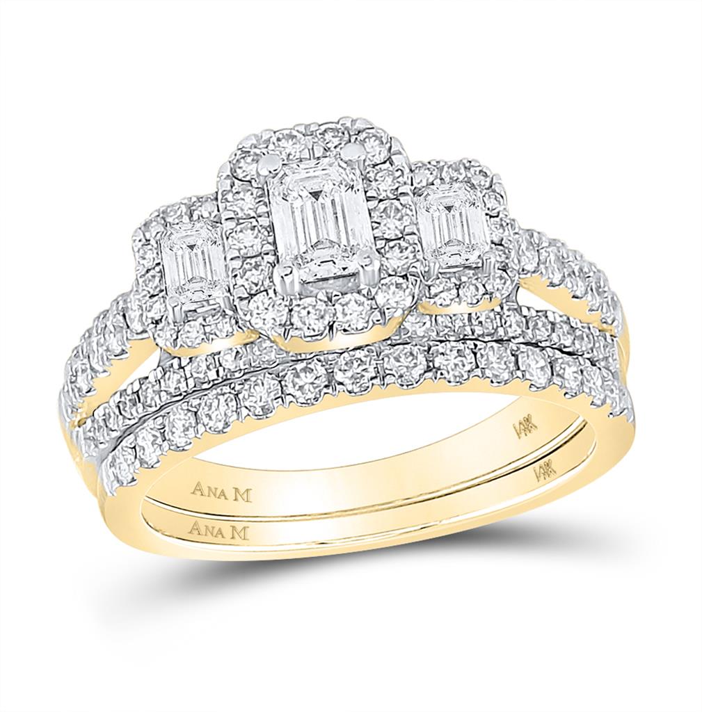 This bridal wedding ring set is made of 14kt yellow gold and features a total gemstone carat weight of 1 & 1/2. The primary gem is a diamond in an emerald shape, with a color grade of G-H and a clarity grade of SI3. It is set in a 4-prong setting and has a carat weight of 0.4. The second gem is also a diamond in an emerald shape, with a color grade of G-H and a clarity grade of SI2. It is also set in a 4-prong setting and has a carat weight of 0.3. The third gem is a round diamond with a color grade of G-H and a clarity grade of I1-I2. It is prong-set and has the largest carat weight of 0.81. This ring set is certified and has an approximate gram weight of 5.7414.