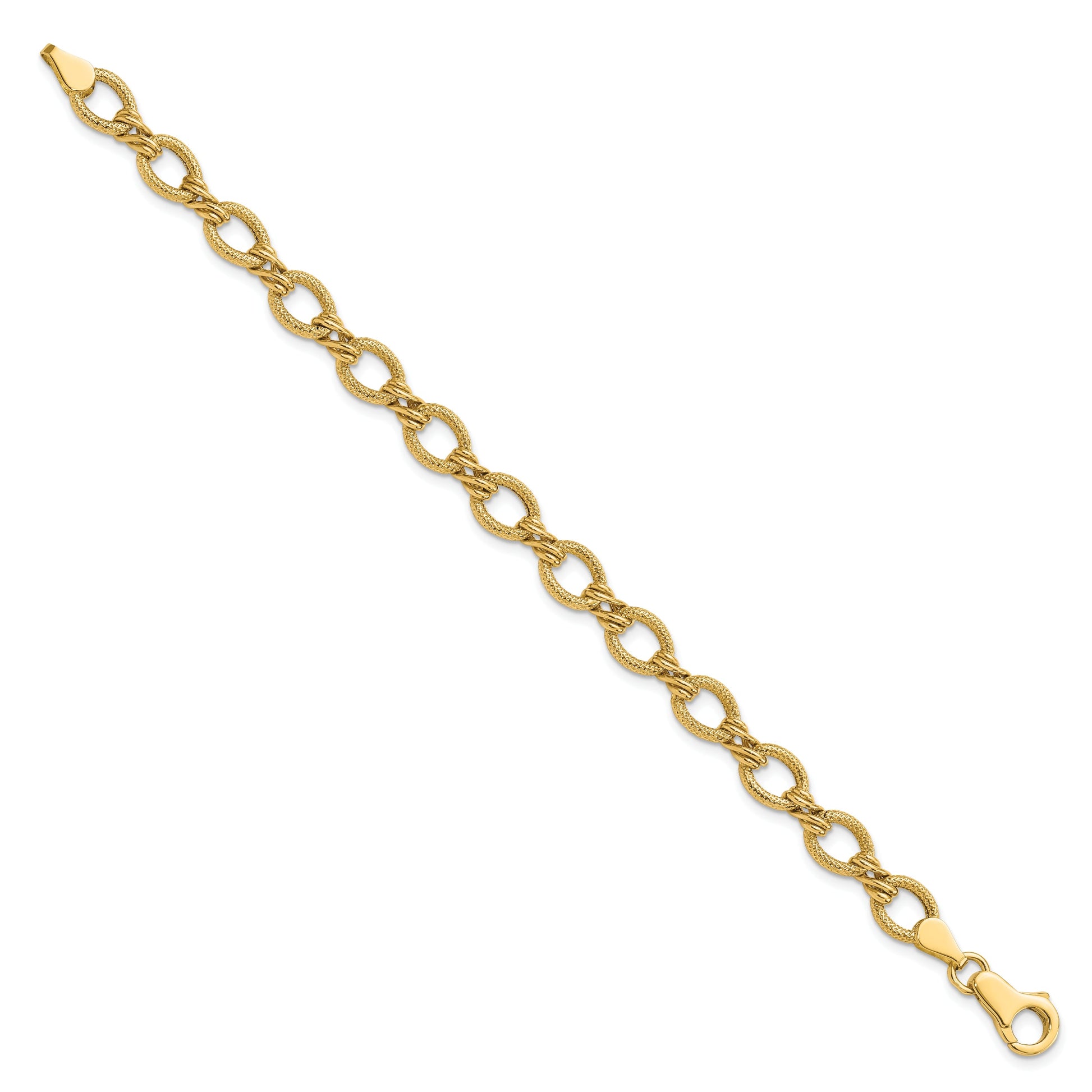 The 14K Yellow Gold Fancy Bracelet is a stylish piece perfect for everyday wear. Made with genuine 14-karat gold, it offers a polished, shiny finish that catches the eye. The bracelet measures 7 inches long and features a bold 7mm textured chain with a fancy lobster clasp for a secure fit. Its hollow design adds to its comfort and lightweight feel. This unisex bracelet combines classic style with modern flair, making it a versatile addition to any jewelry collection. The 14K Yellow Gold Fancy Bracelet is a strong and elegant choice for those who want jewelry that stands out.