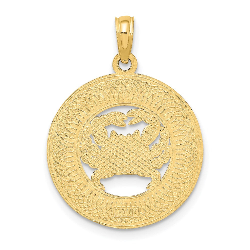 Introducing the stunning 'KEY WEST w/Crab Circle Charm' made of high-quality 14k Yellow Gold. This beautiful piece weighs 1.92 GM and has a polished finish, adding a luxurious touch to any outfit. With a length of 24.55 mm, a charm/element length of 19.05 mm, a thickness of 0.85 mm, and a width of 19.05 mm, this jewelry is expertly crafted using the casting technique. The pendant/charm type is themed, offering a textured look that catches the eye. Sold by unit, this piece of jewelry is perfect for any occasion. The bail width measures 5mm while the bail length is 7mm, making it easy to wear with any chain. Add a touch of elegance to your look with this one-of-a-kind piece of jewelry.